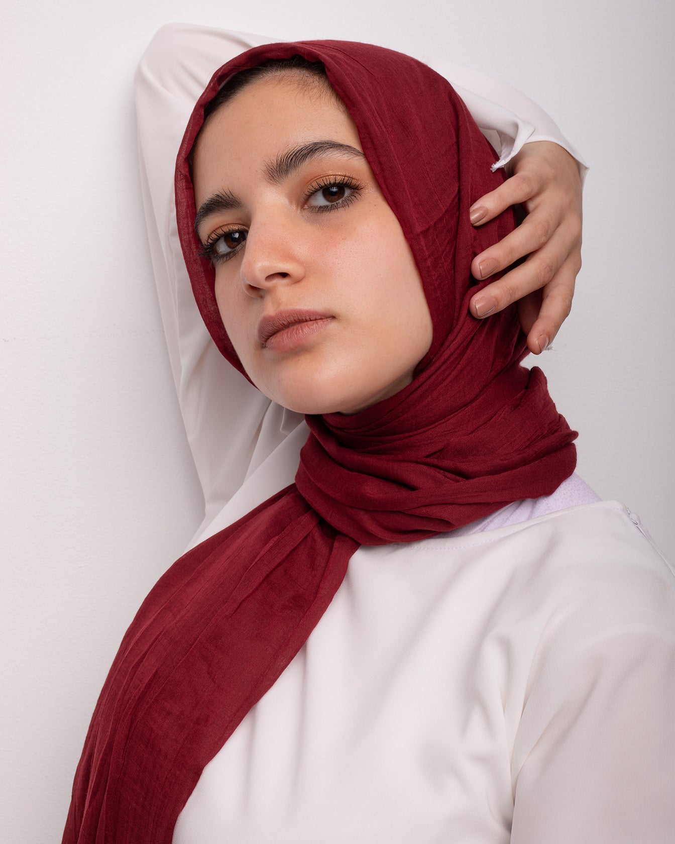 A basic scarf is an essential piece in every hijabi wardrobe. The soft poly fiber material of the scarf feels way smoother than any other fabric. It's lightweight makes it extra comfortable. The solid color, crinkled style and the fringed ends of the scarf add to its elegance and delicacy