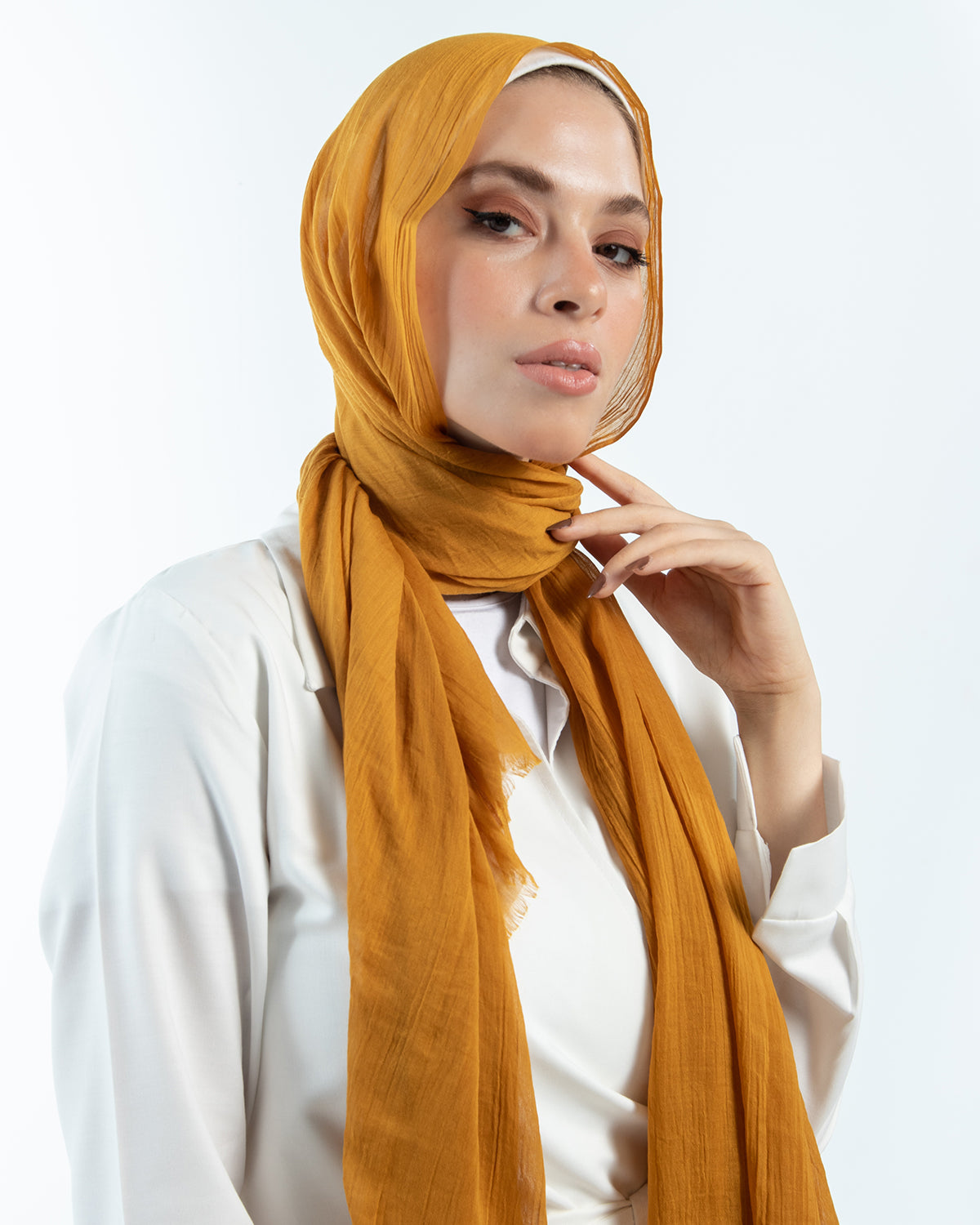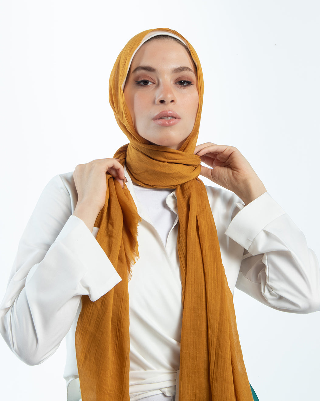 A basic scarf is an essential piece in every hijabi wardrobe. The soft poly fiber material of the scarf feels way smoother than any other fabric. It's lightweight makes it extra comfortable. The solid color, crinkled style and the fringed ends of the scarf add to its elegance and delicacy