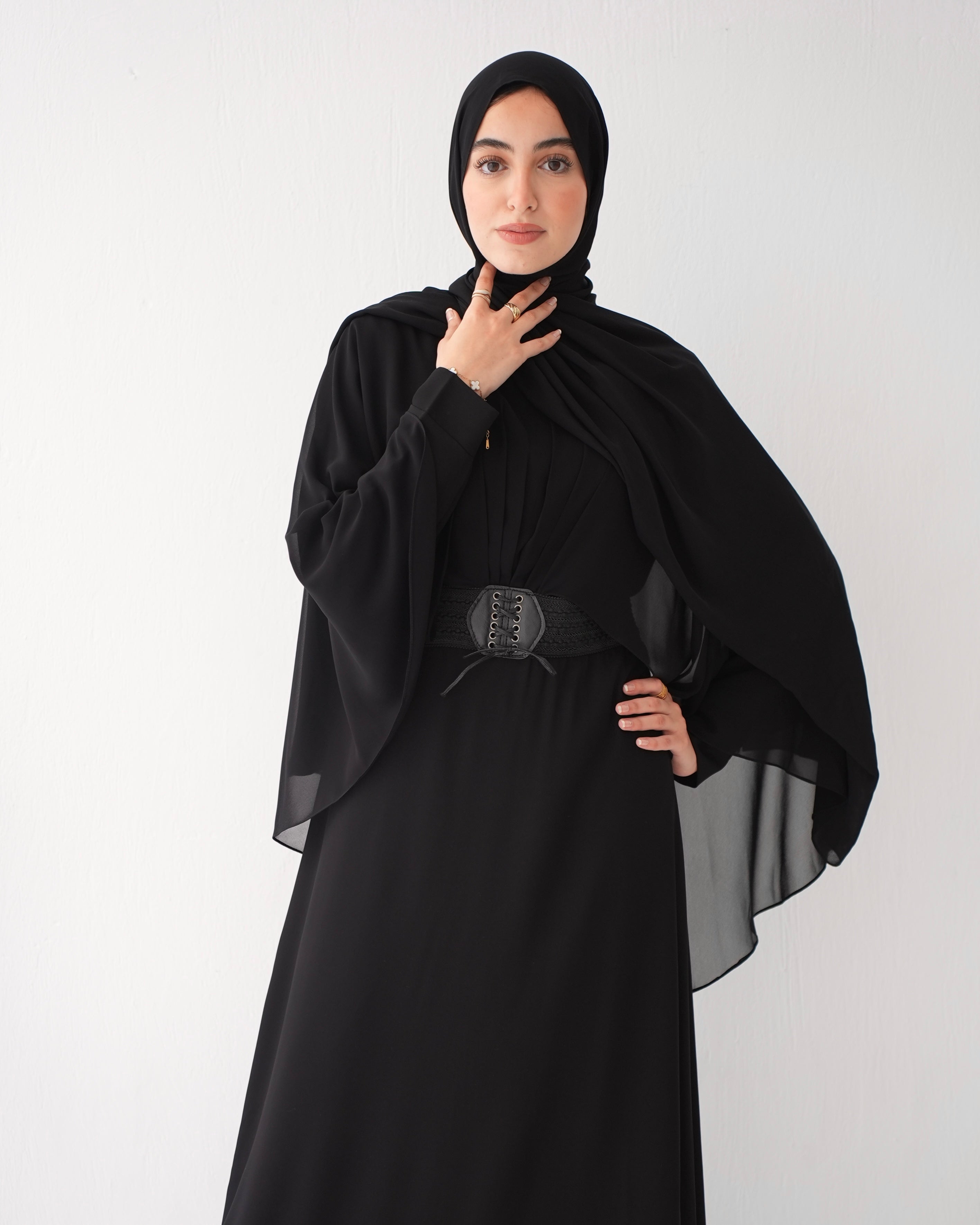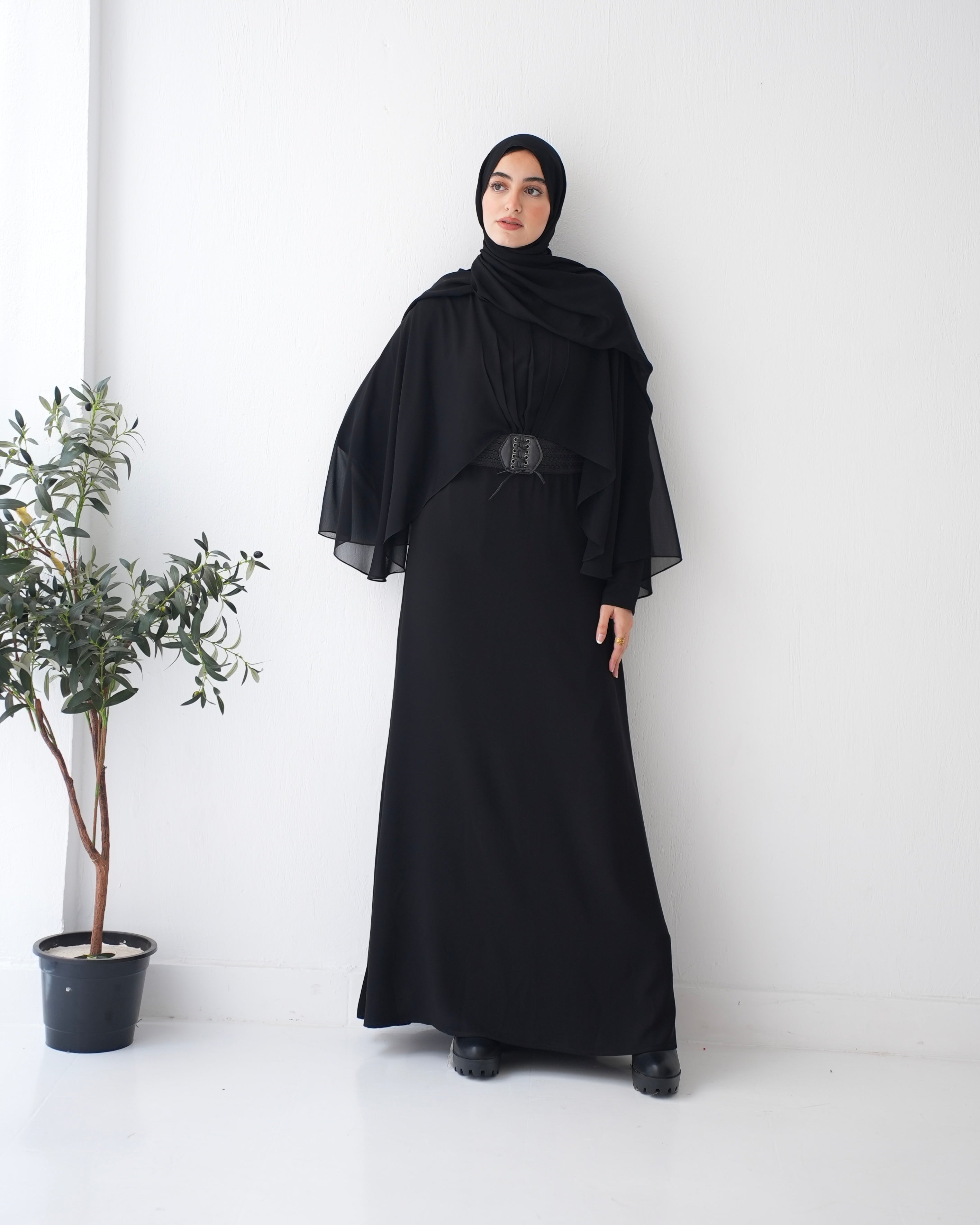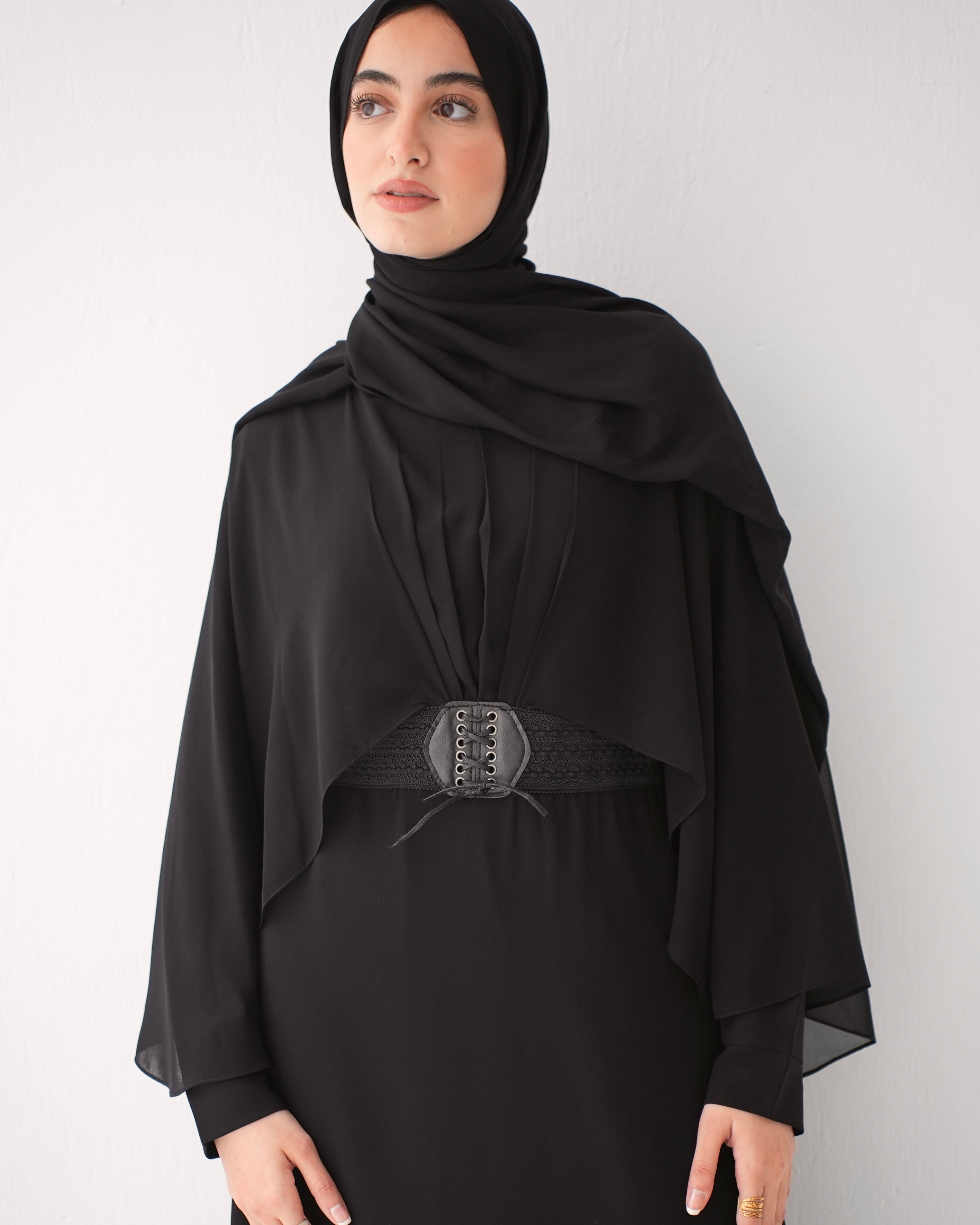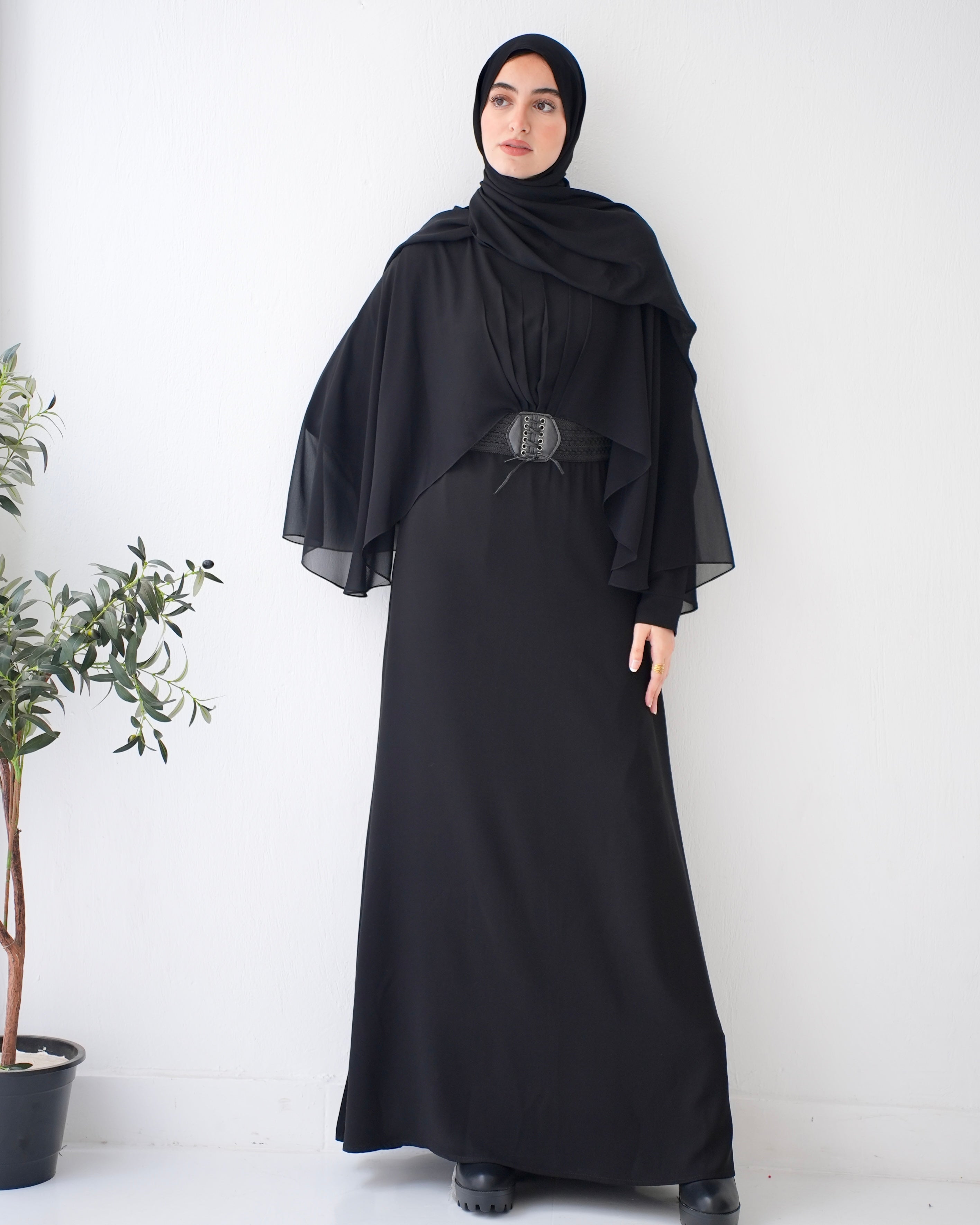 Elevate your wardrobe with our Crepe Abaya with Chiffon Cape and Elegant Belt, a timeless piece that effortlessly combines sophistication with modesty.