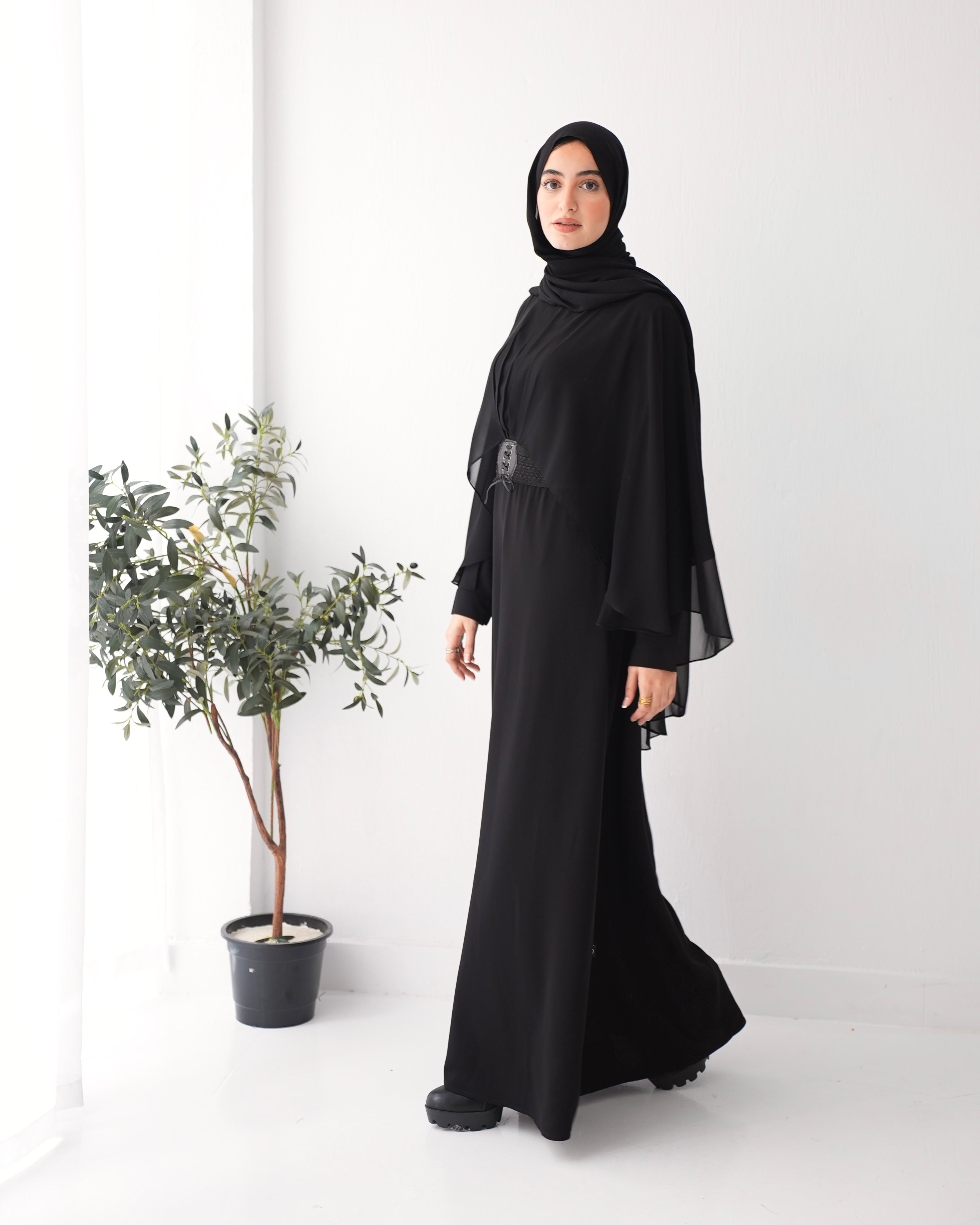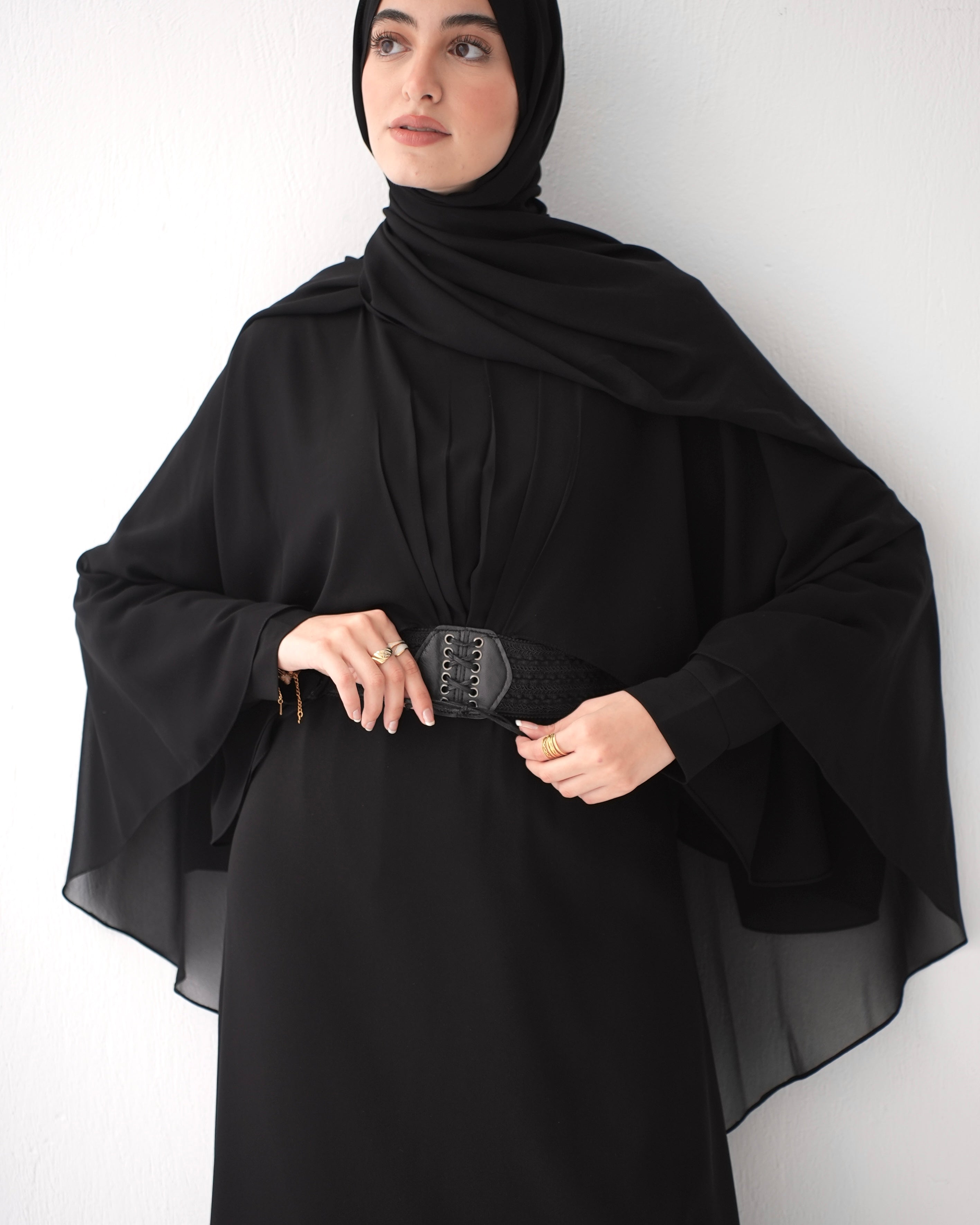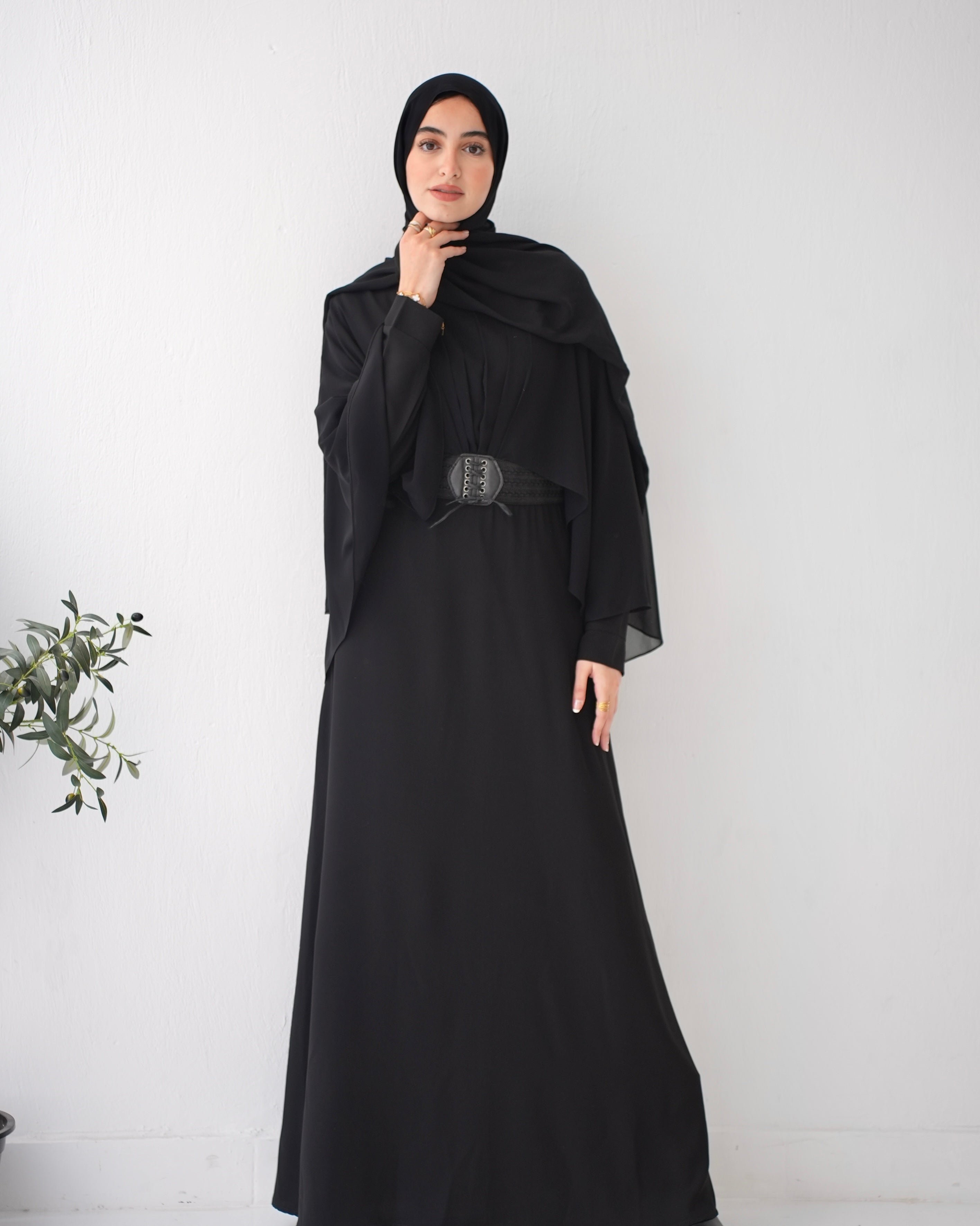 Elevate your wardrobe with our Crepe Abaya with Chiffon Cape and Elegant Belt, a timeless piece that effortlessly combines sophistication with modesty.