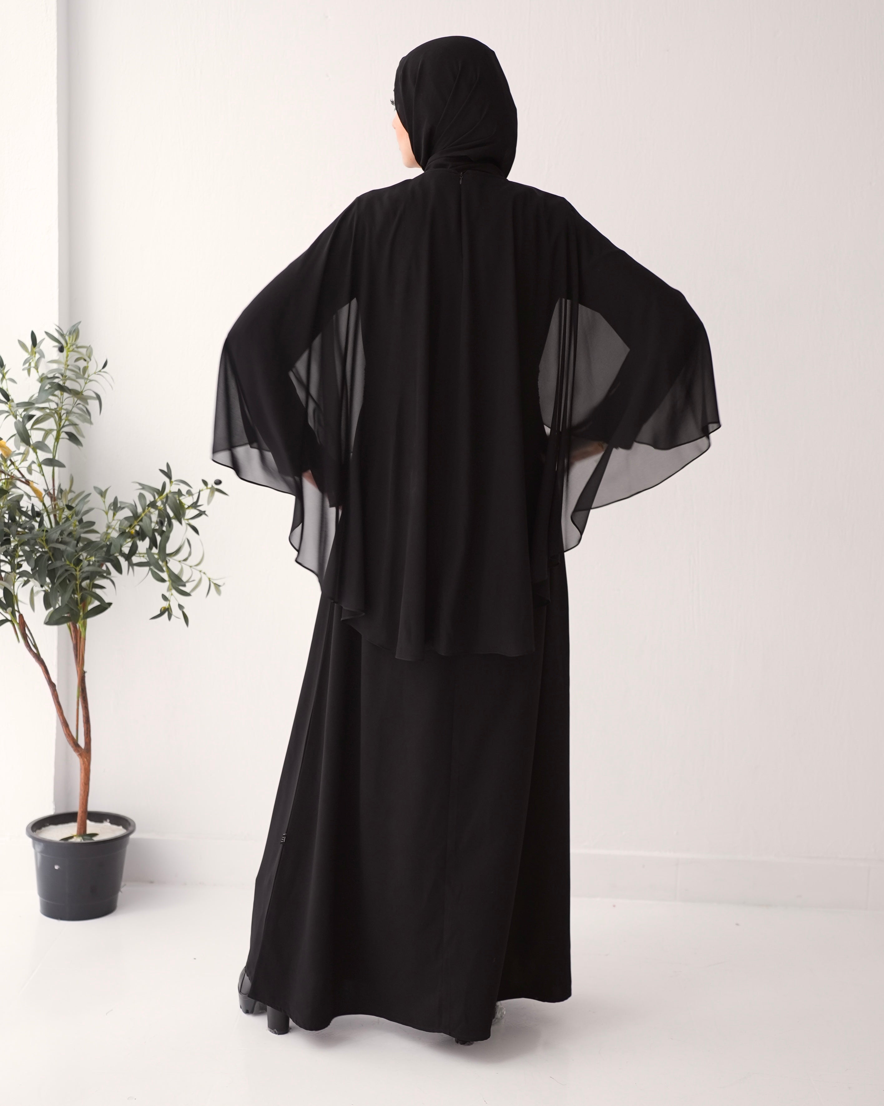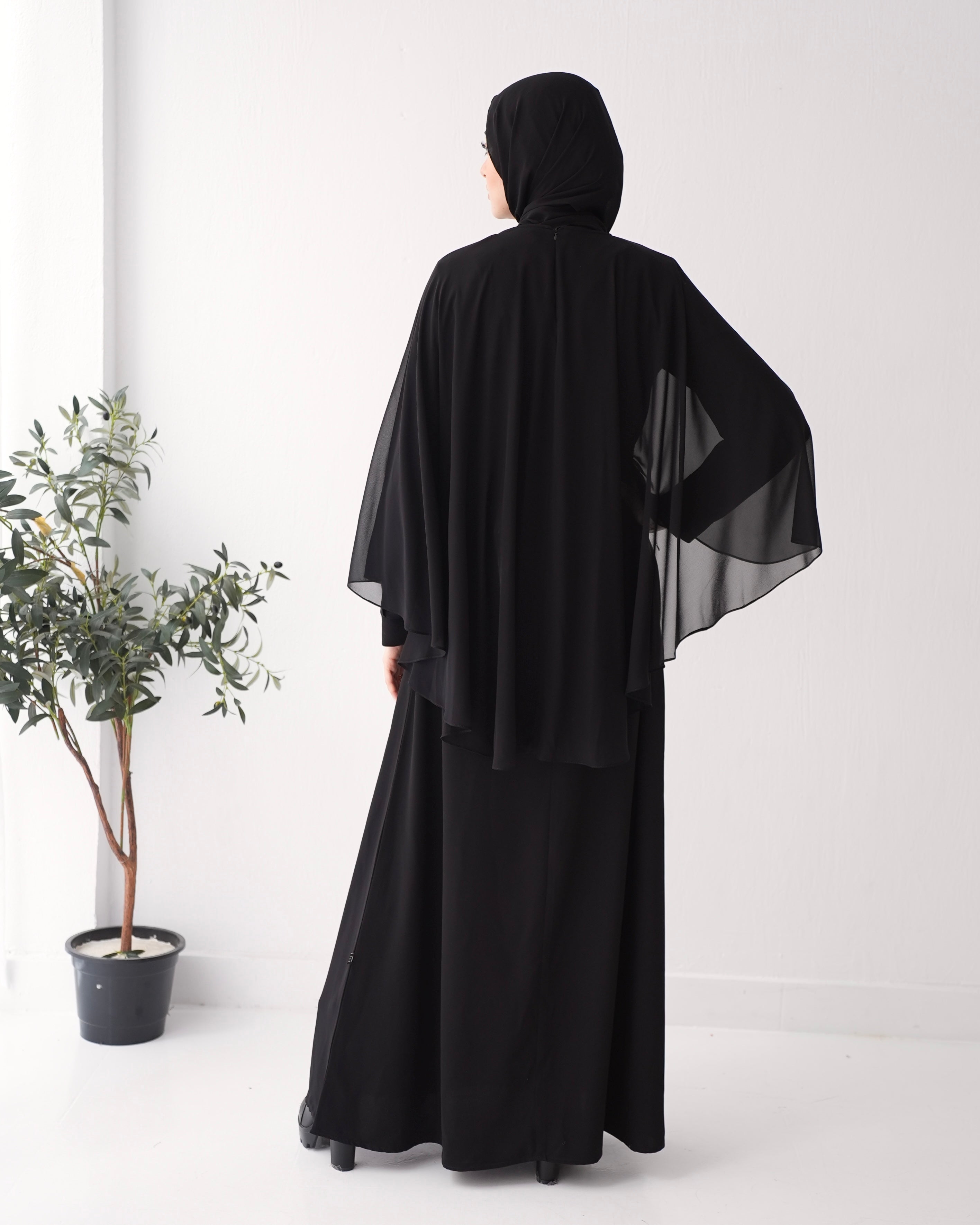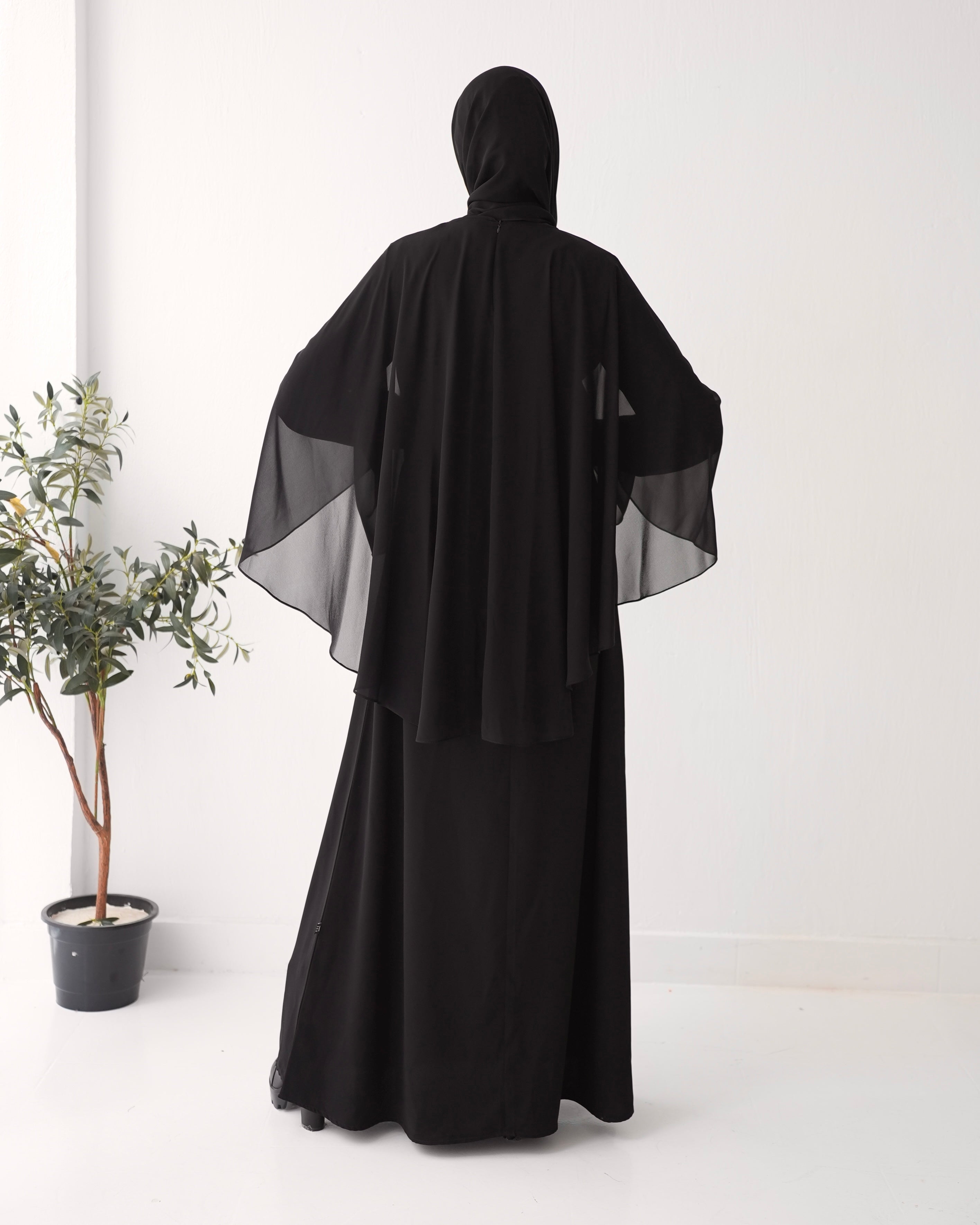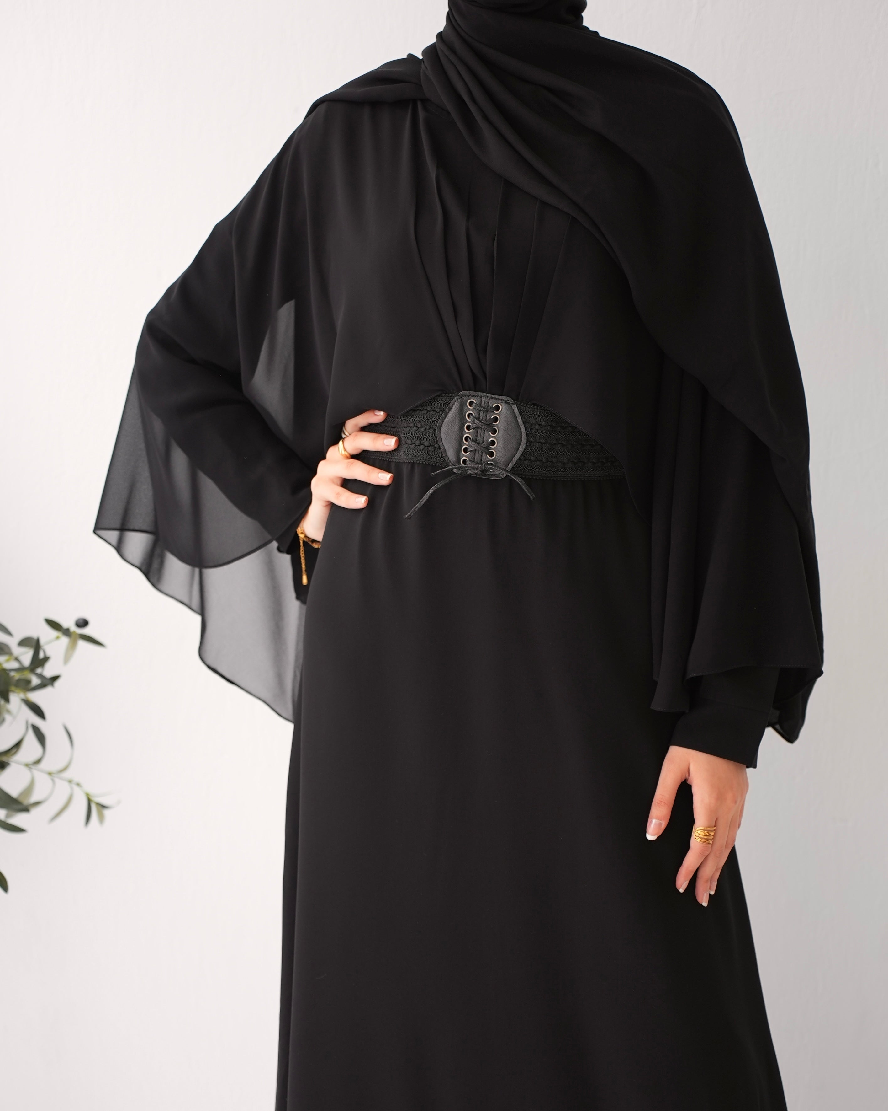Elevate your wardrobe with our Crepe Abaya with Chiffon Cape and Elegant Belt, a timeless piece that effortlessly combines sophistication with modesty.