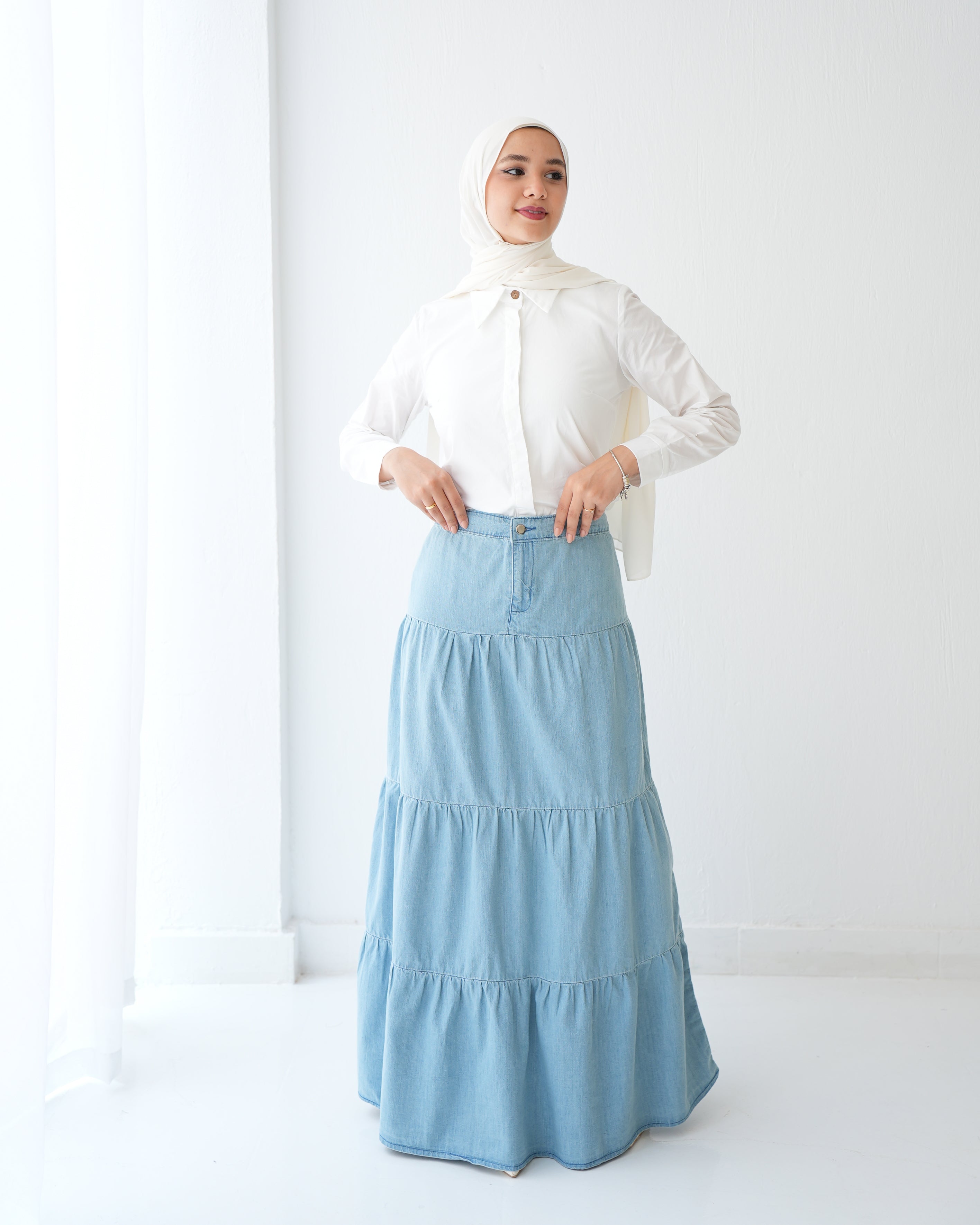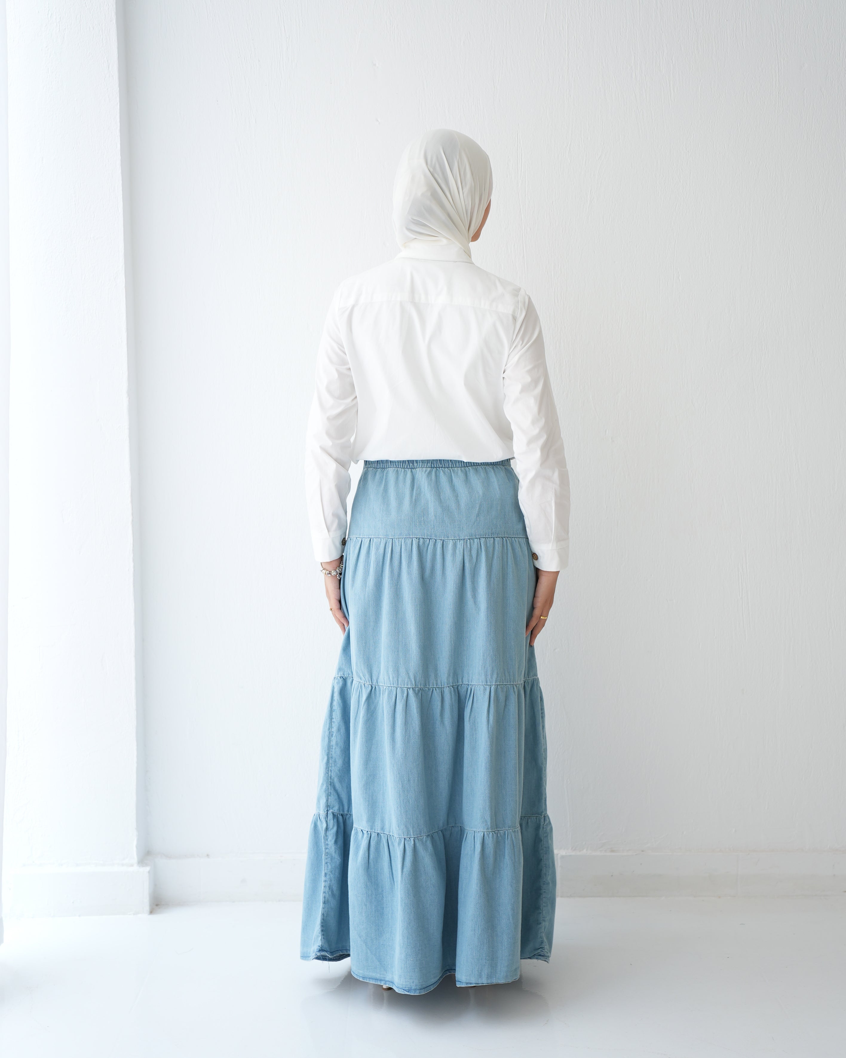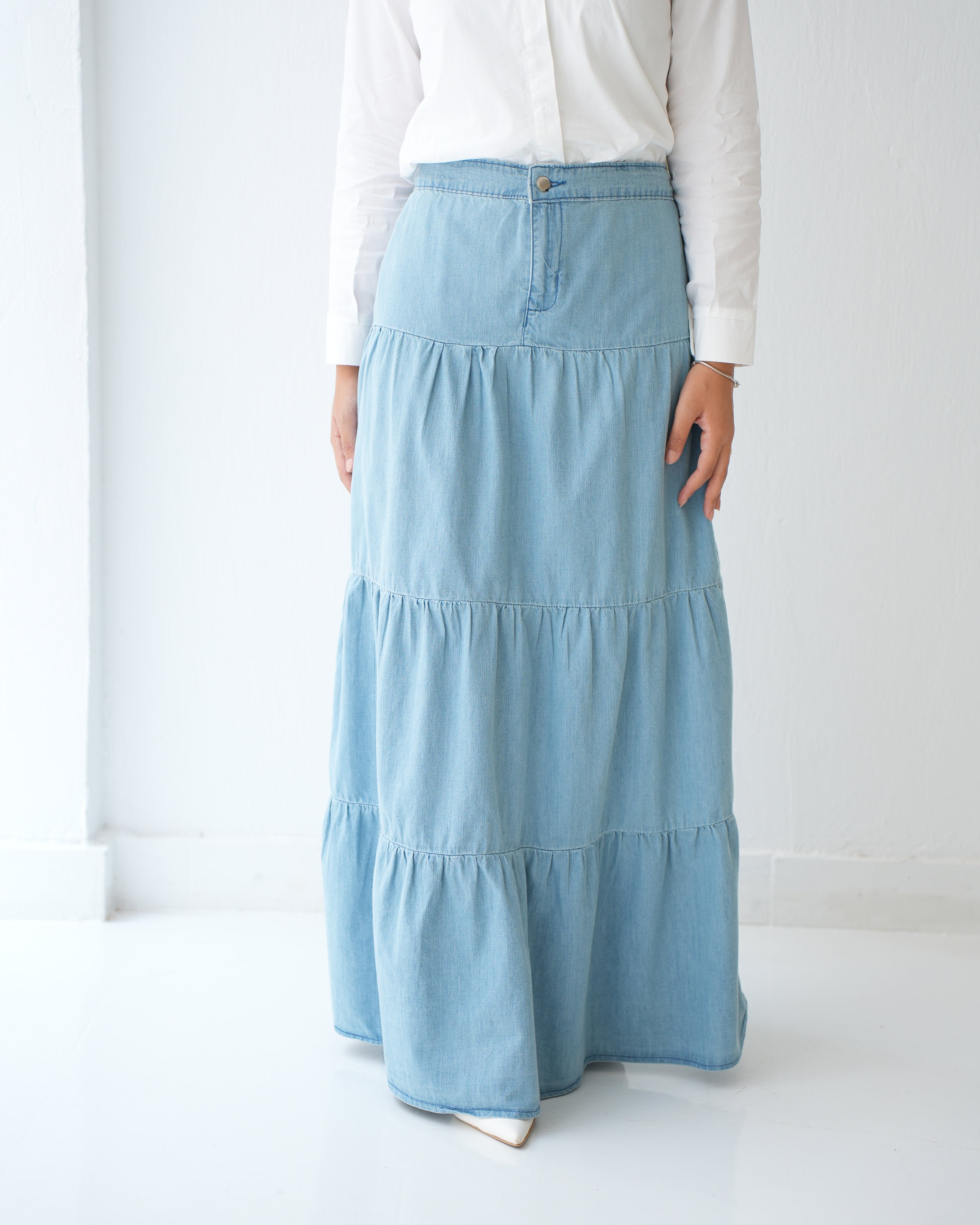 Denim Tiered Maxi Skirt Blue C8221