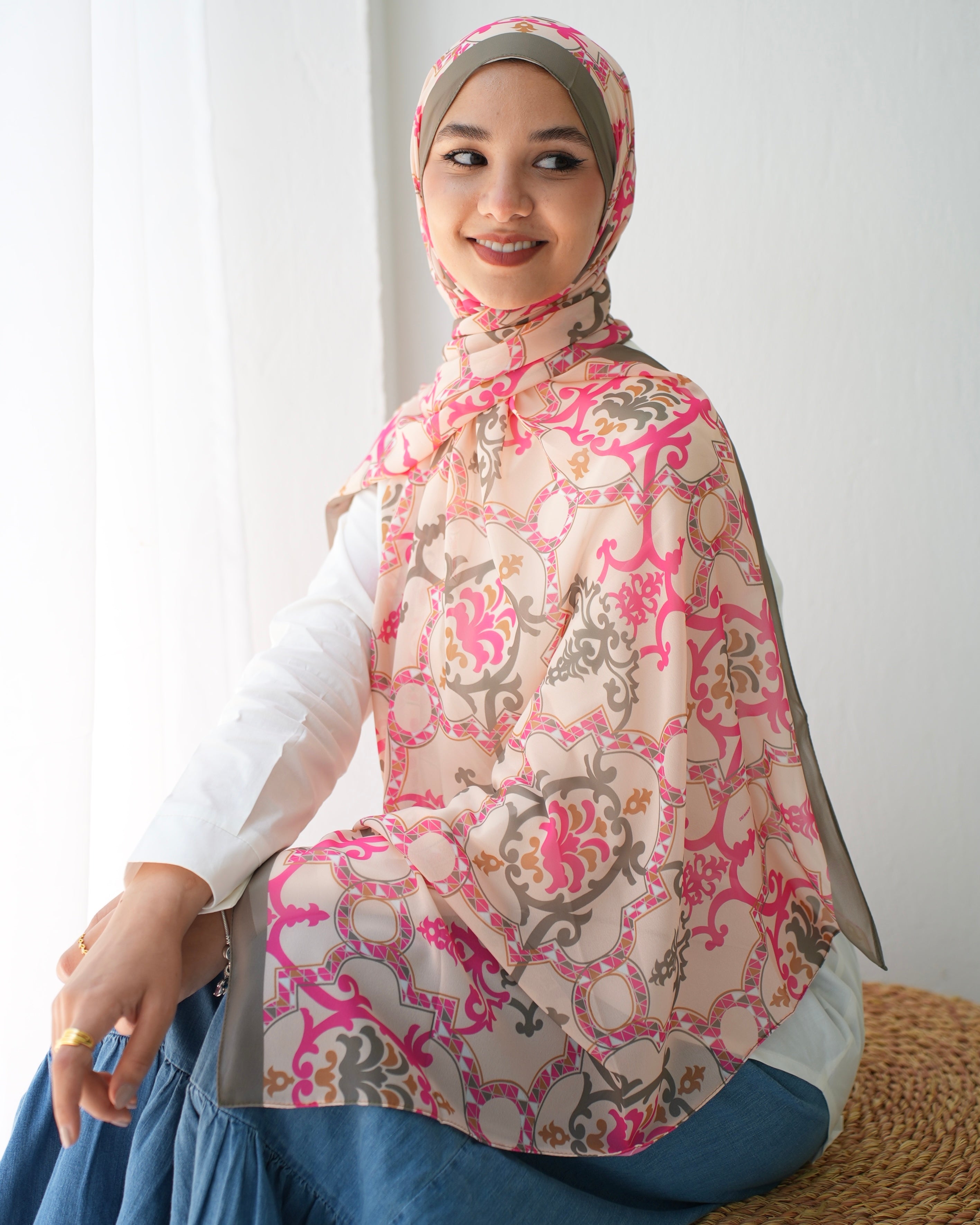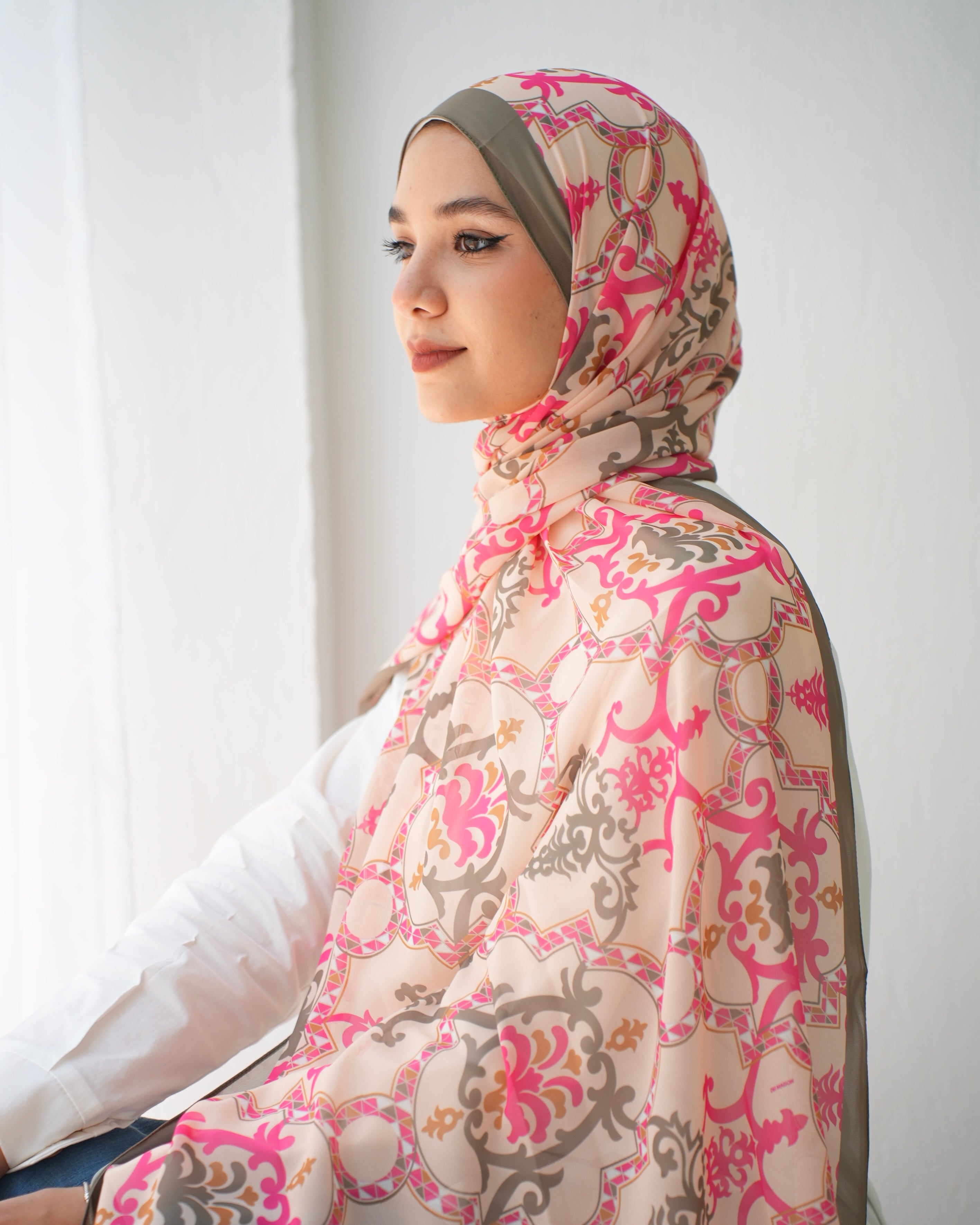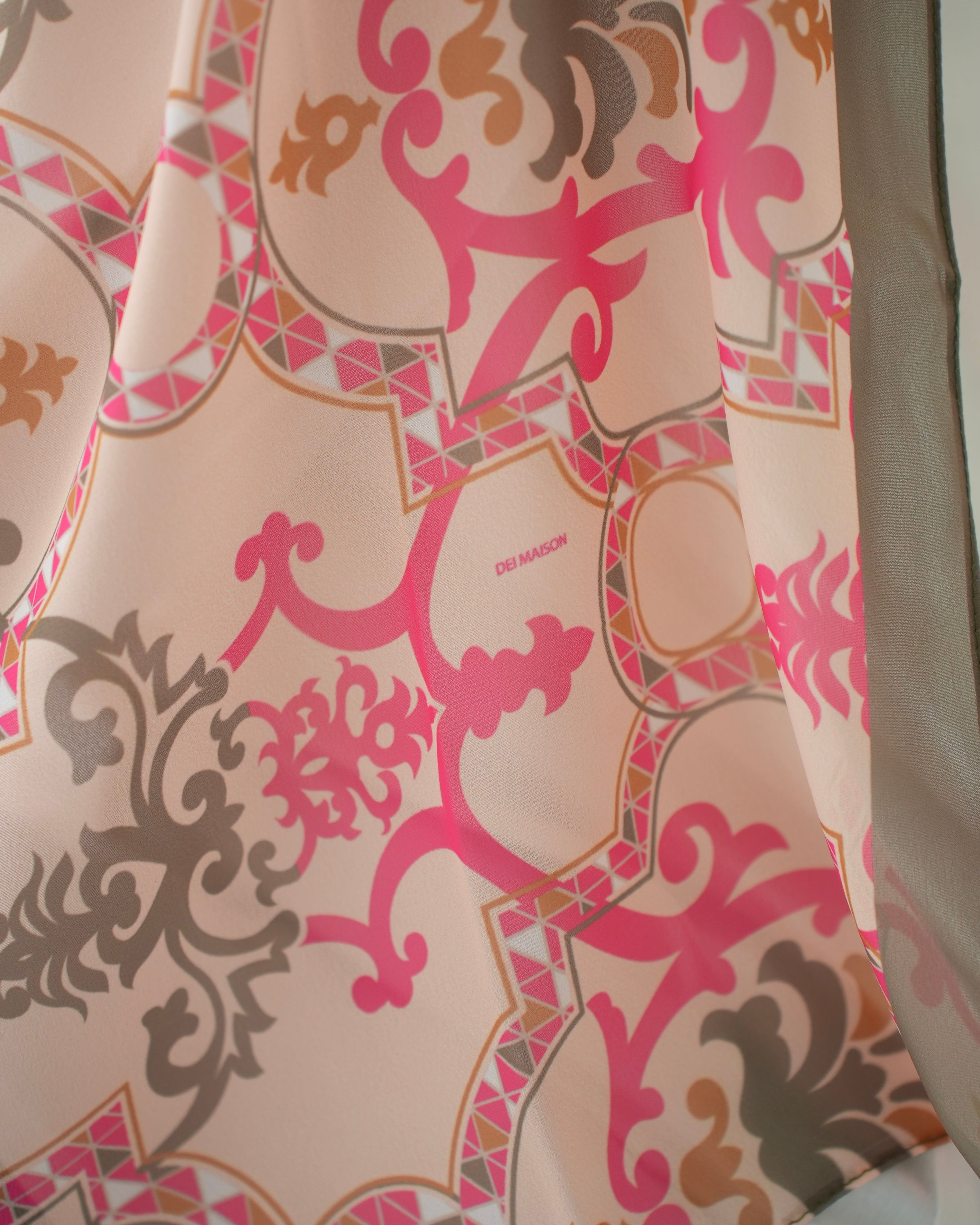 Crafted with meticulous detail, this scarf features a mesmerizing pattern that exudes grace and elegance. The combination of hot pink, olive, and beige colors creates a harmonious palette that effortlessly complements a wide range of outfits. The vibrant hot pink adds a lively pop of color, while the subtle olive and beige tones provide a sense of tranquility and sophistication.