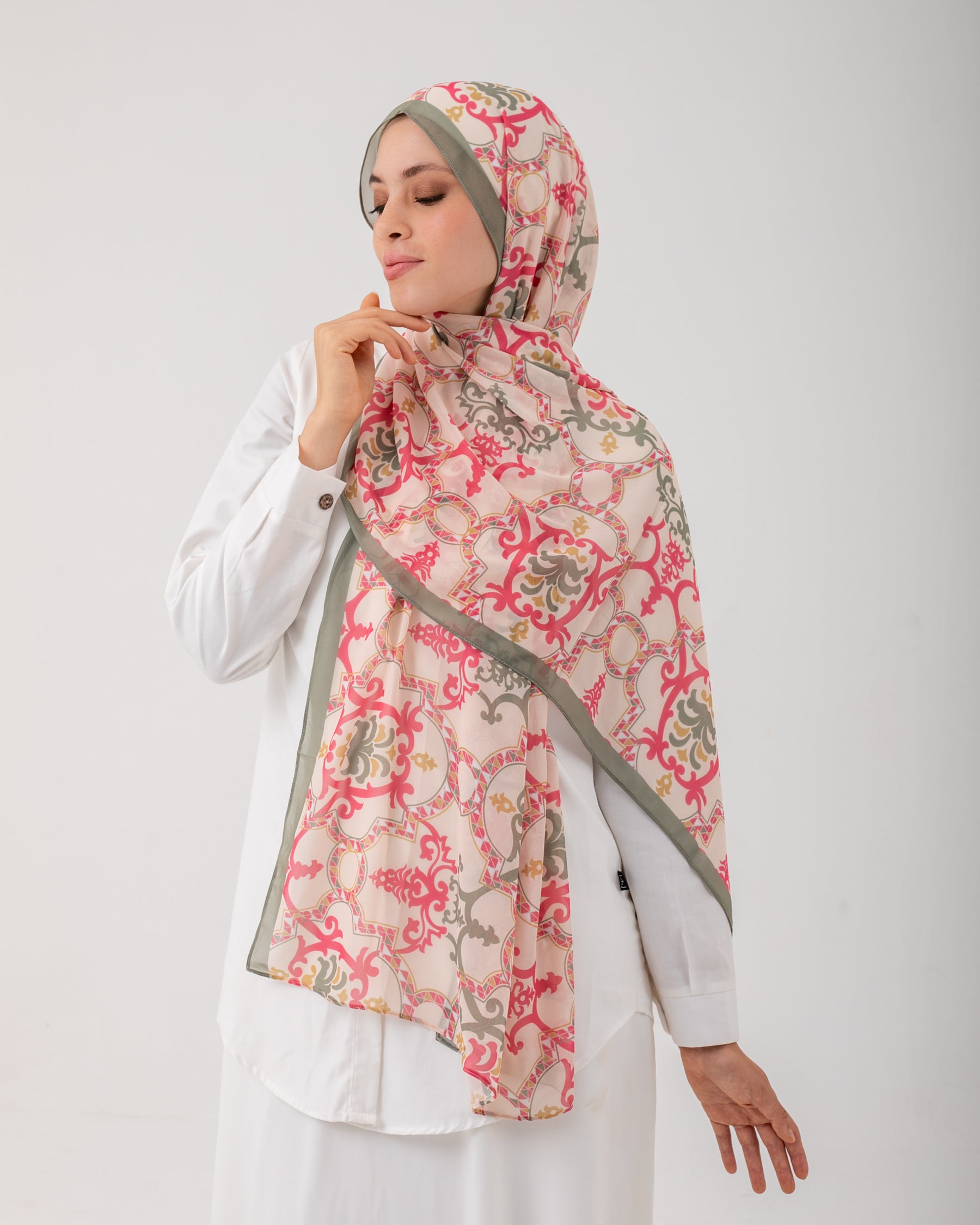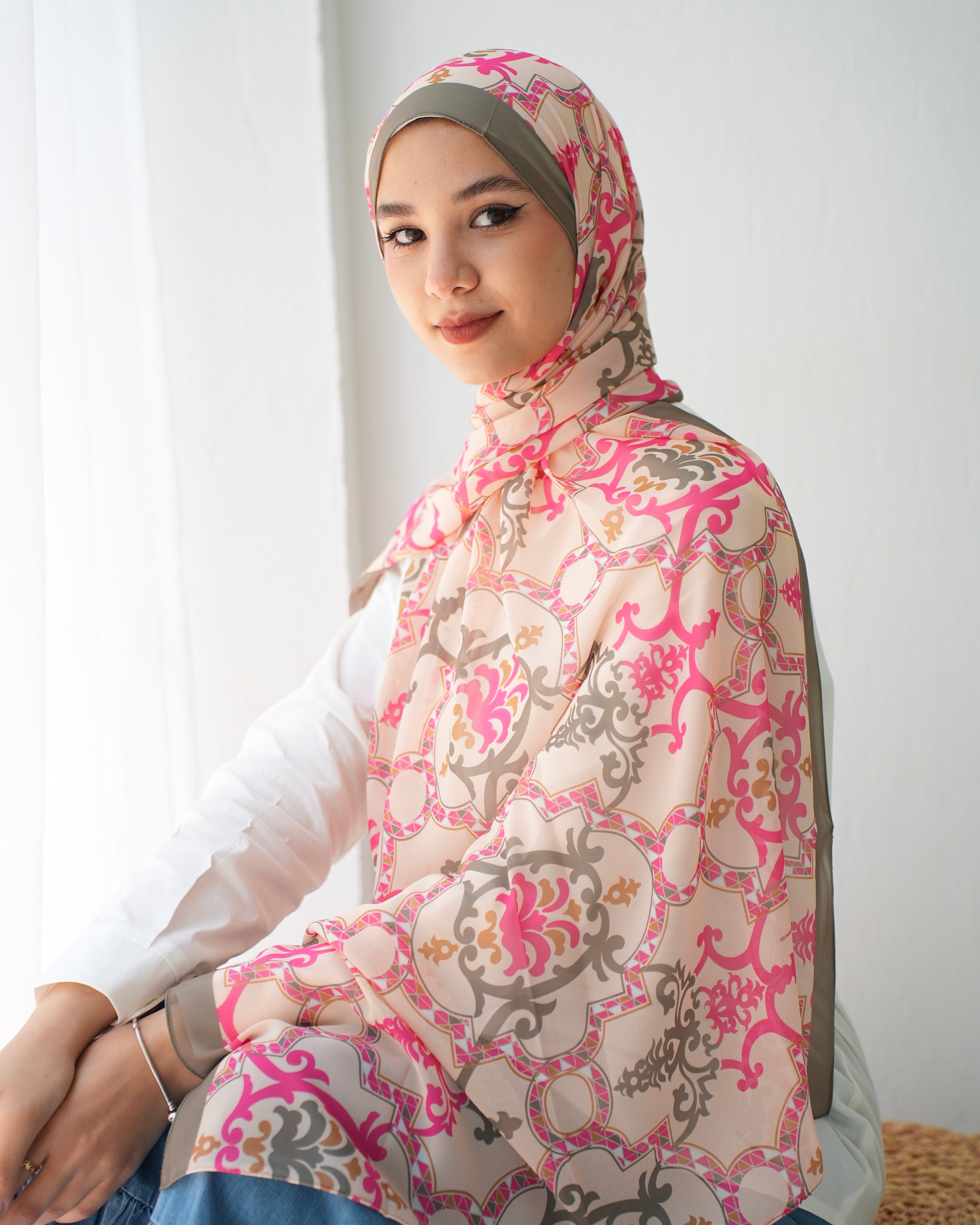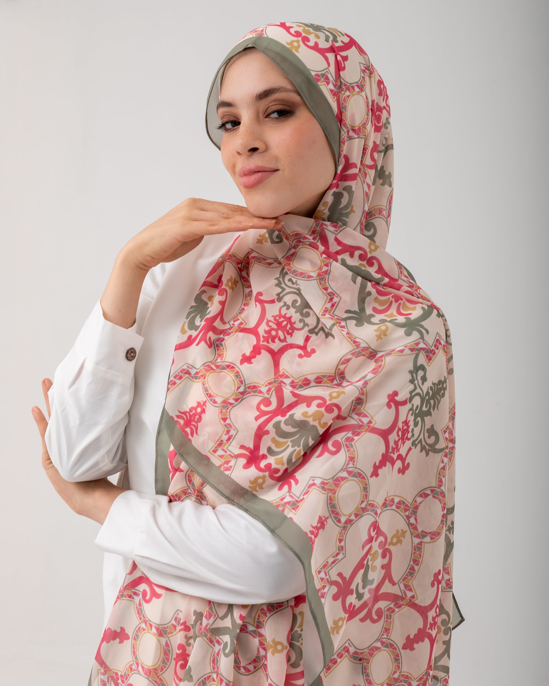 Crafted with meticulous detail, this scarf features a mesmerizing pattern that exudes grace and elegance. The combination of hot pink, olive, and beige colors creates a harmonious palette that effortlessly complements a wide range of outfits. The vibrant hot pink adds a lively pop of color, while the subtle olive and beige tones provide a sense of tranquility and sophistication.