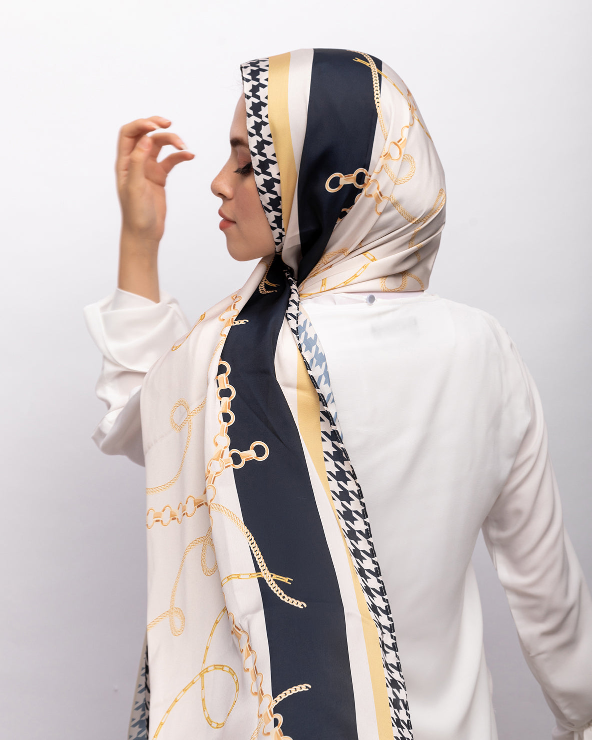 Gold and black colors coupled with the gorgeous chain and outlining houndstooth pattern create such charming elegance of an absolutely glamorous scarf.