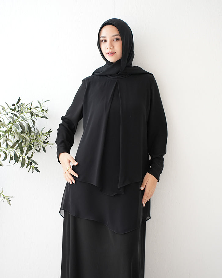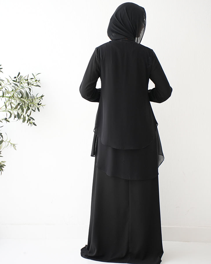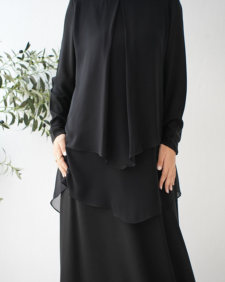Introducing the epitome of sophistication and grace - the Black Crepe Abaya with Chiffon Layers from Dei Maison.