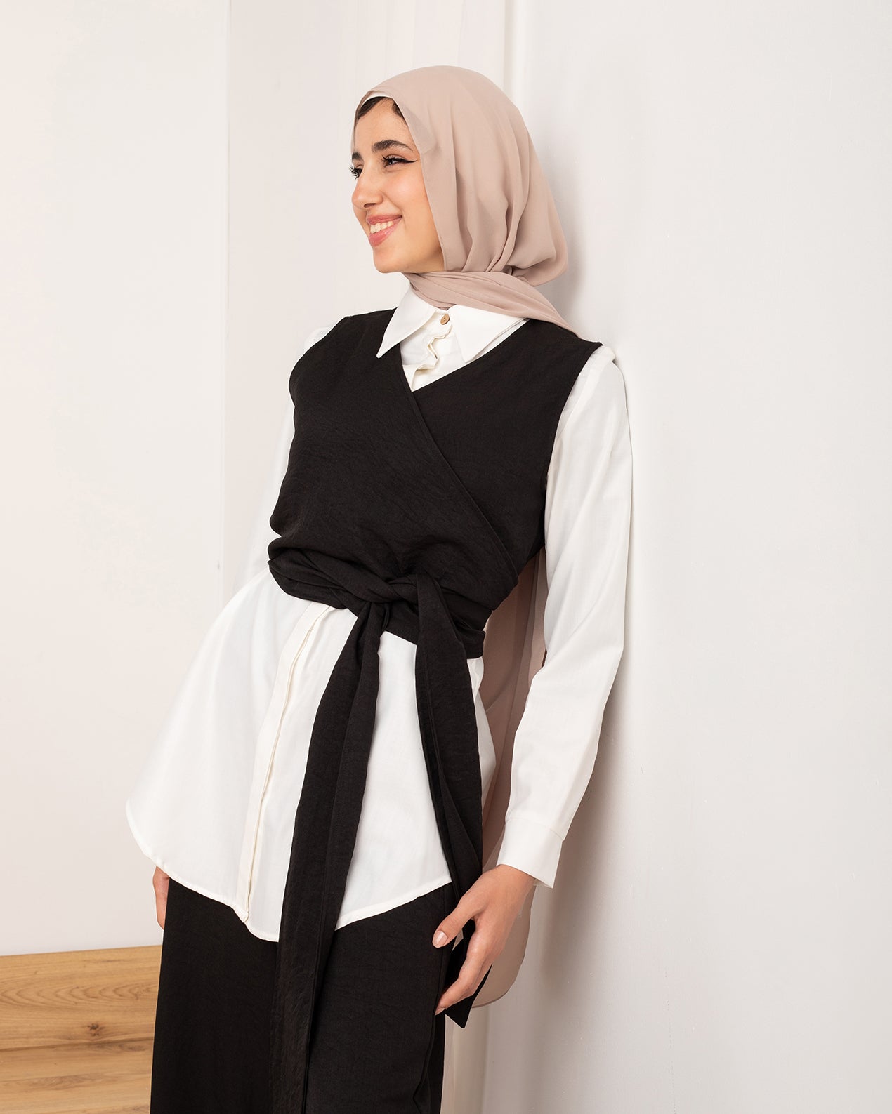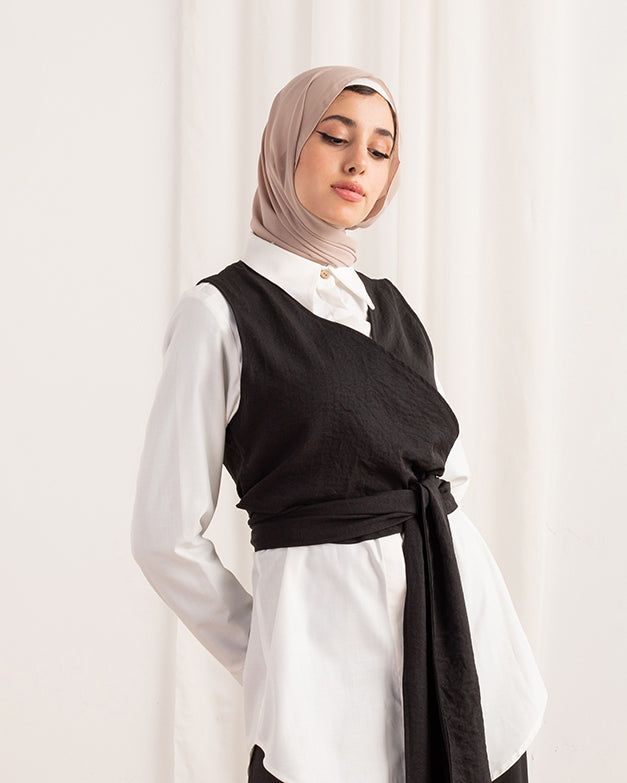 An elegant cross-over sleeveless cropped top with an adjustable strap is the perfect choice for a classic or formal unique look.