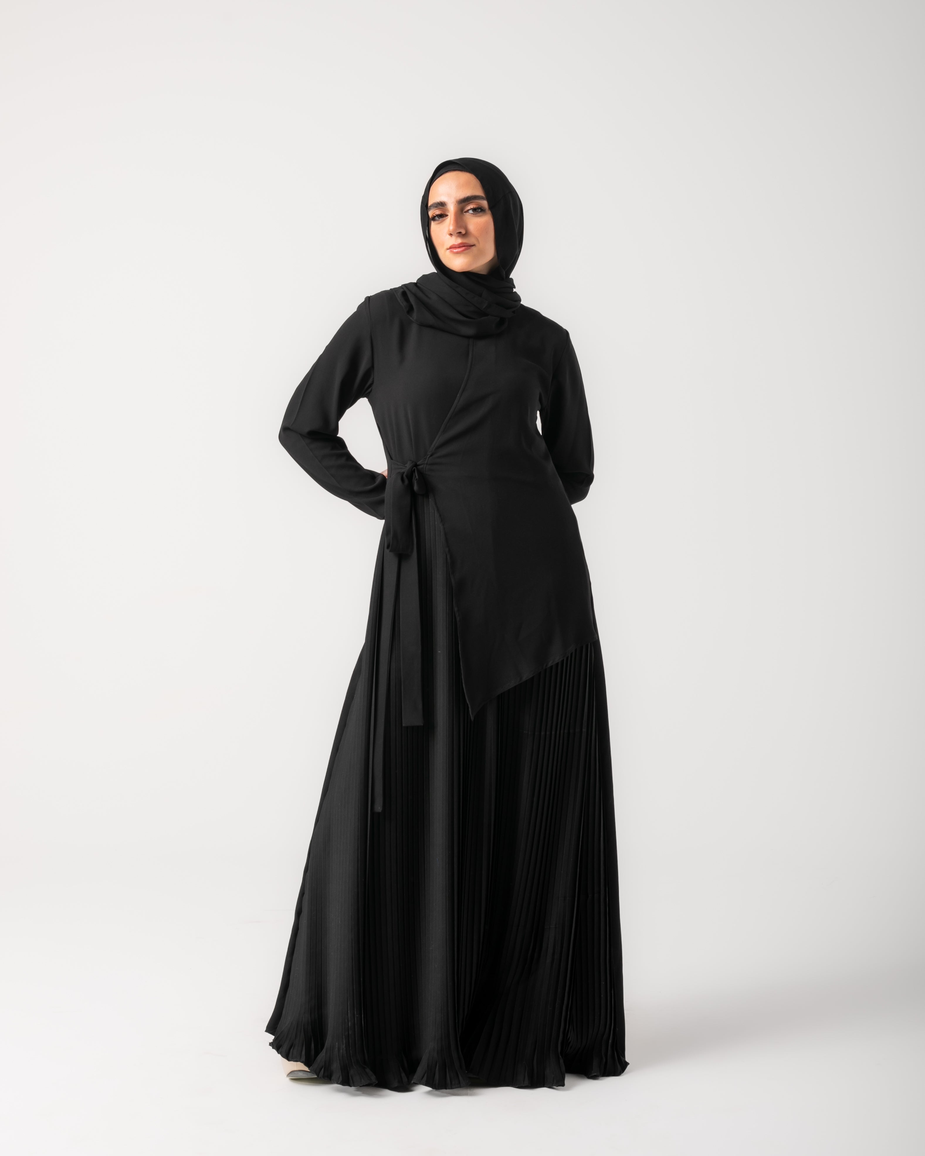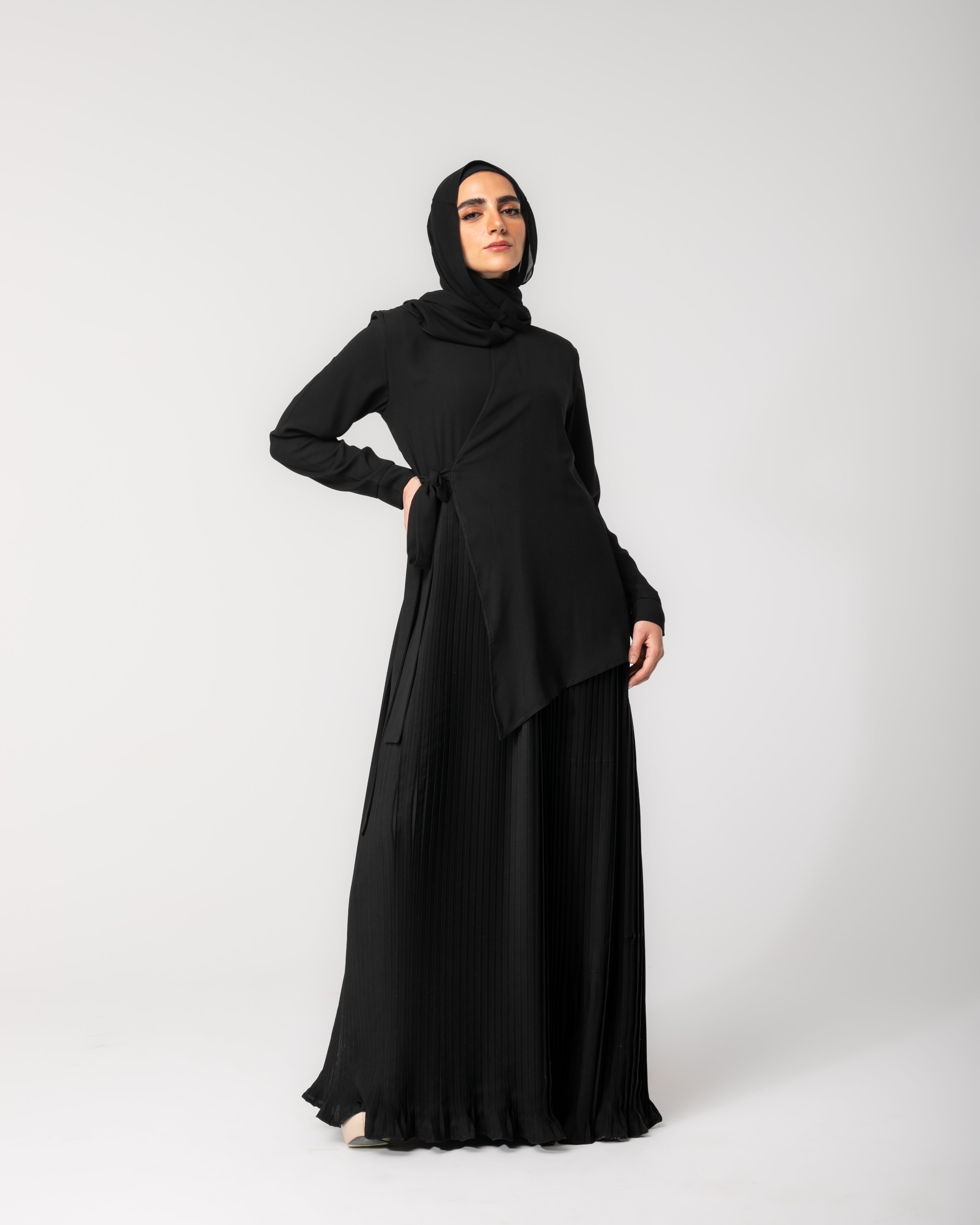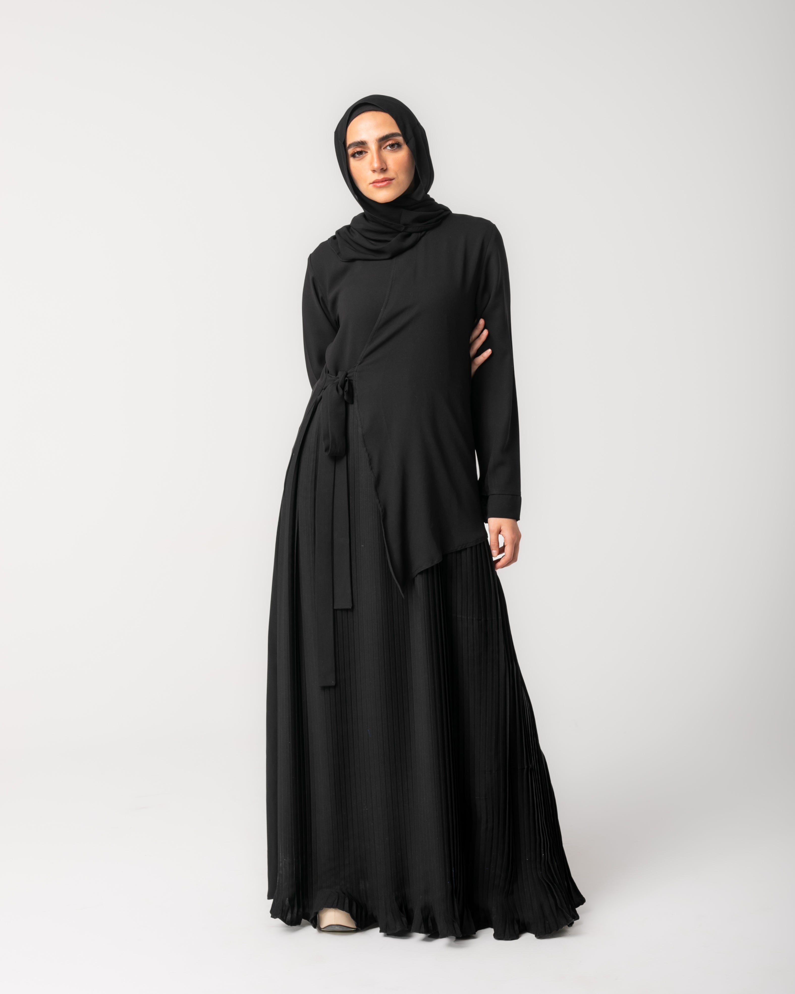 Side Wrap Pleated Abaya Black C113