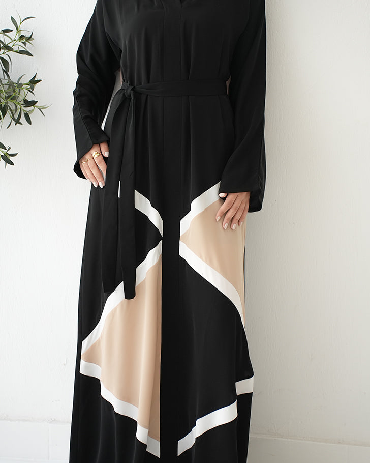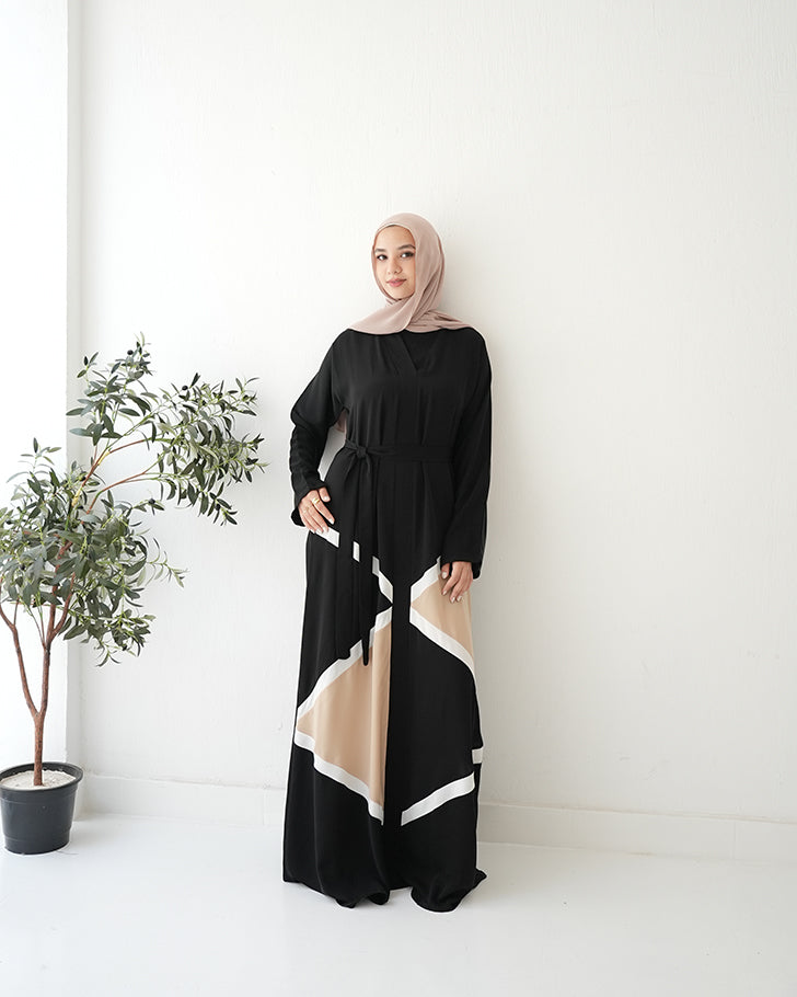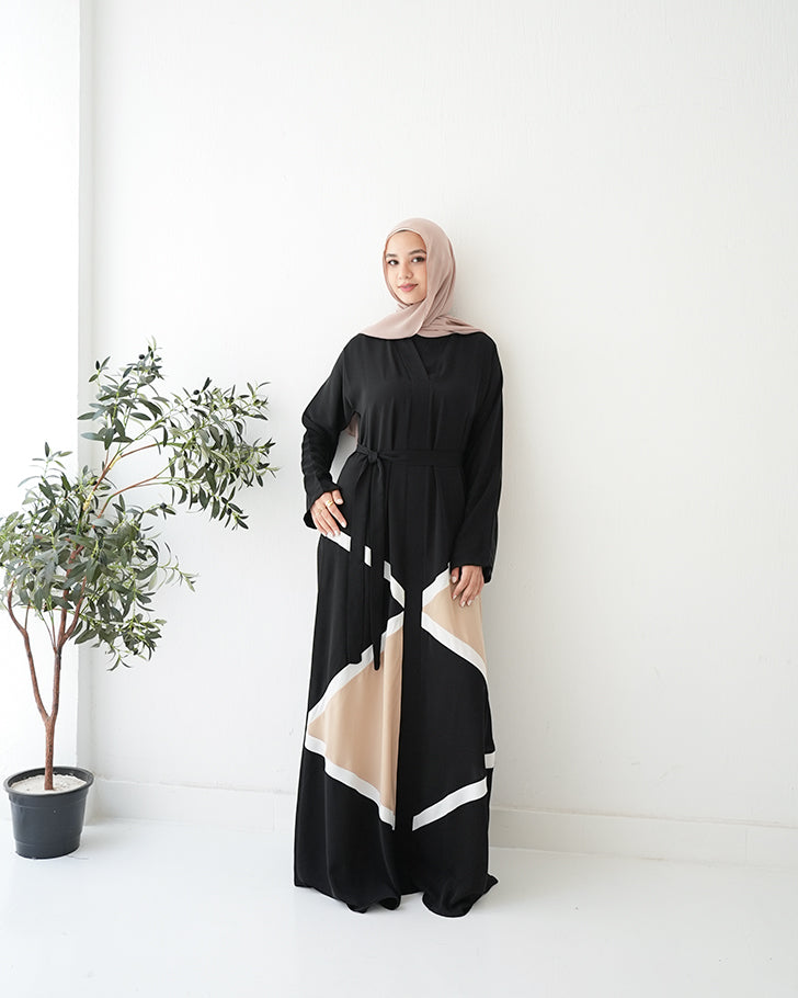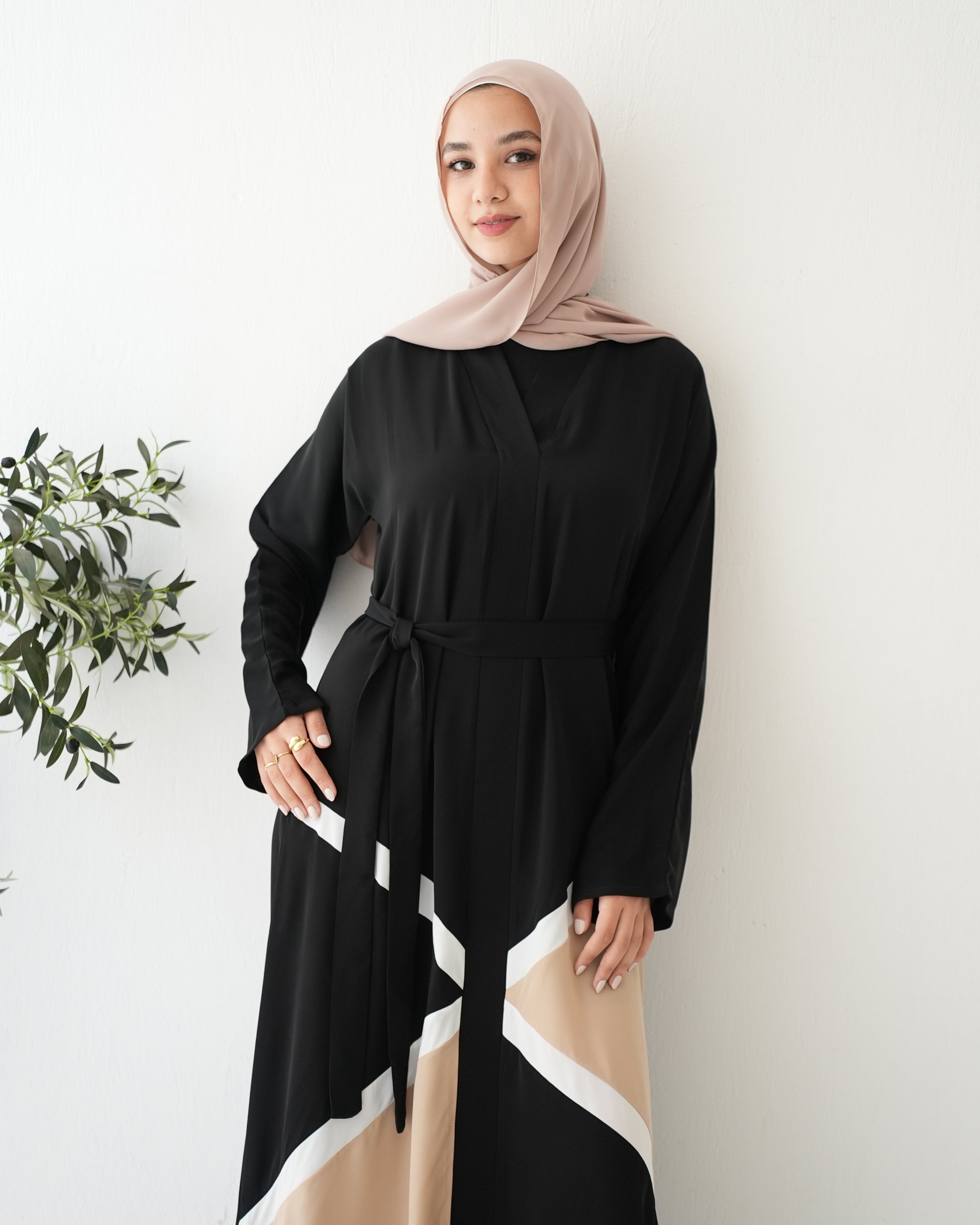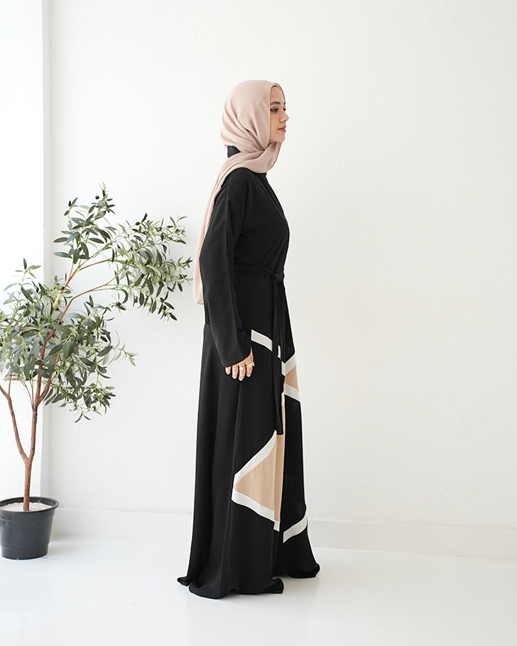 Step into sophistication and elevate your modest wardrobe with the Black Silk Abaya with Off-White and Beige Detail from Dei Maison. Embrace timeless elegance with a modern twist.