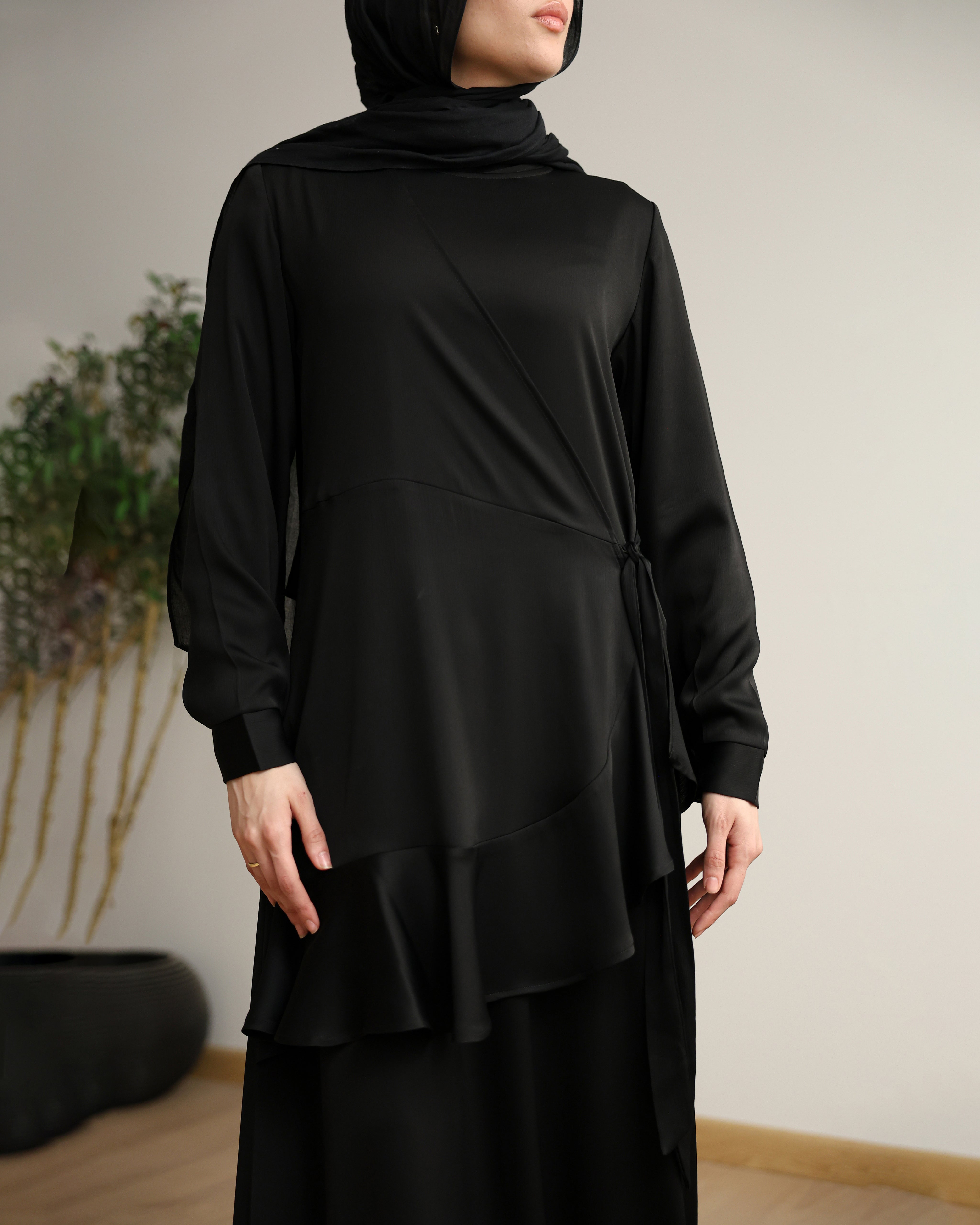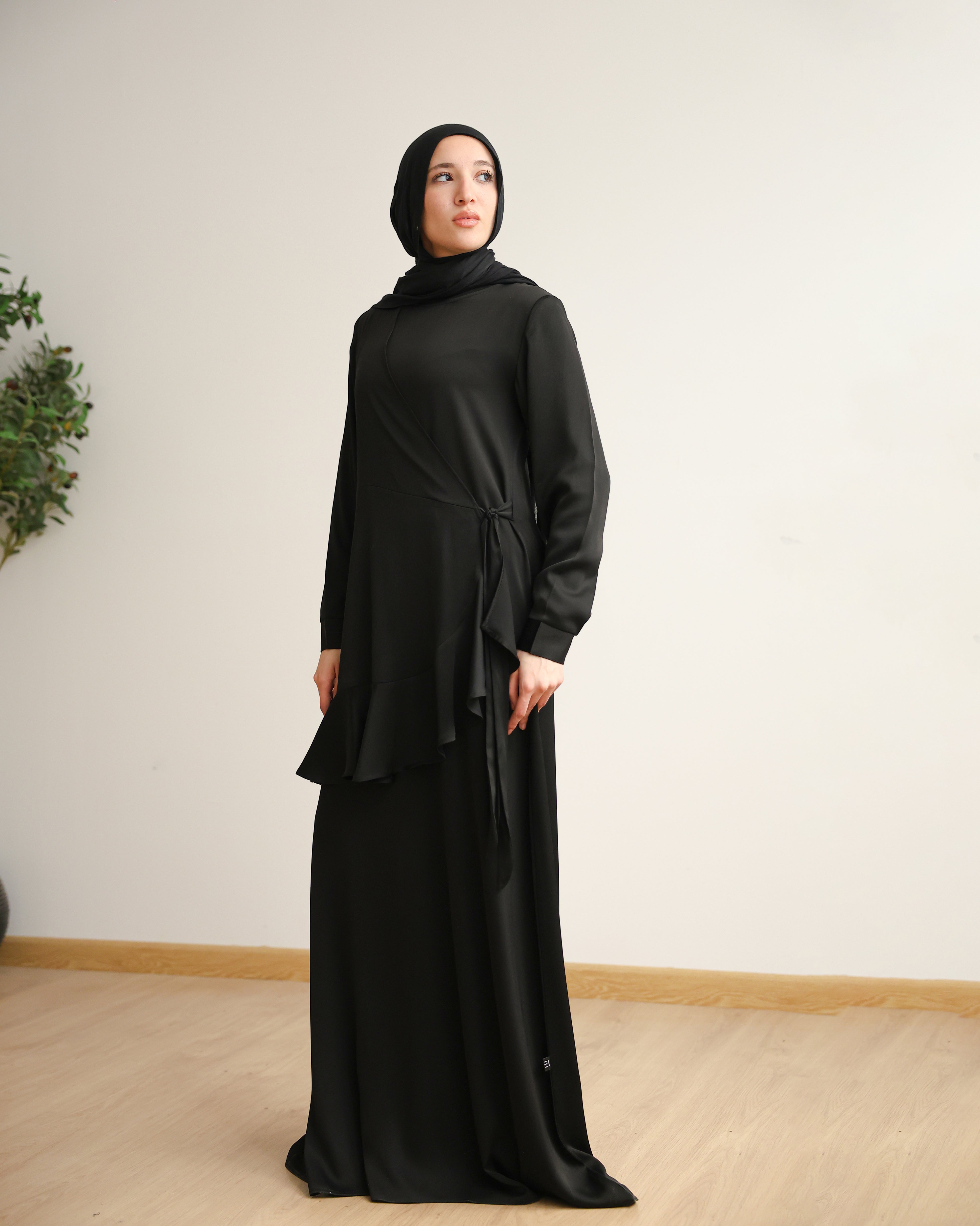 Crepe Abaya with Front Chiffon Pleats Black C740