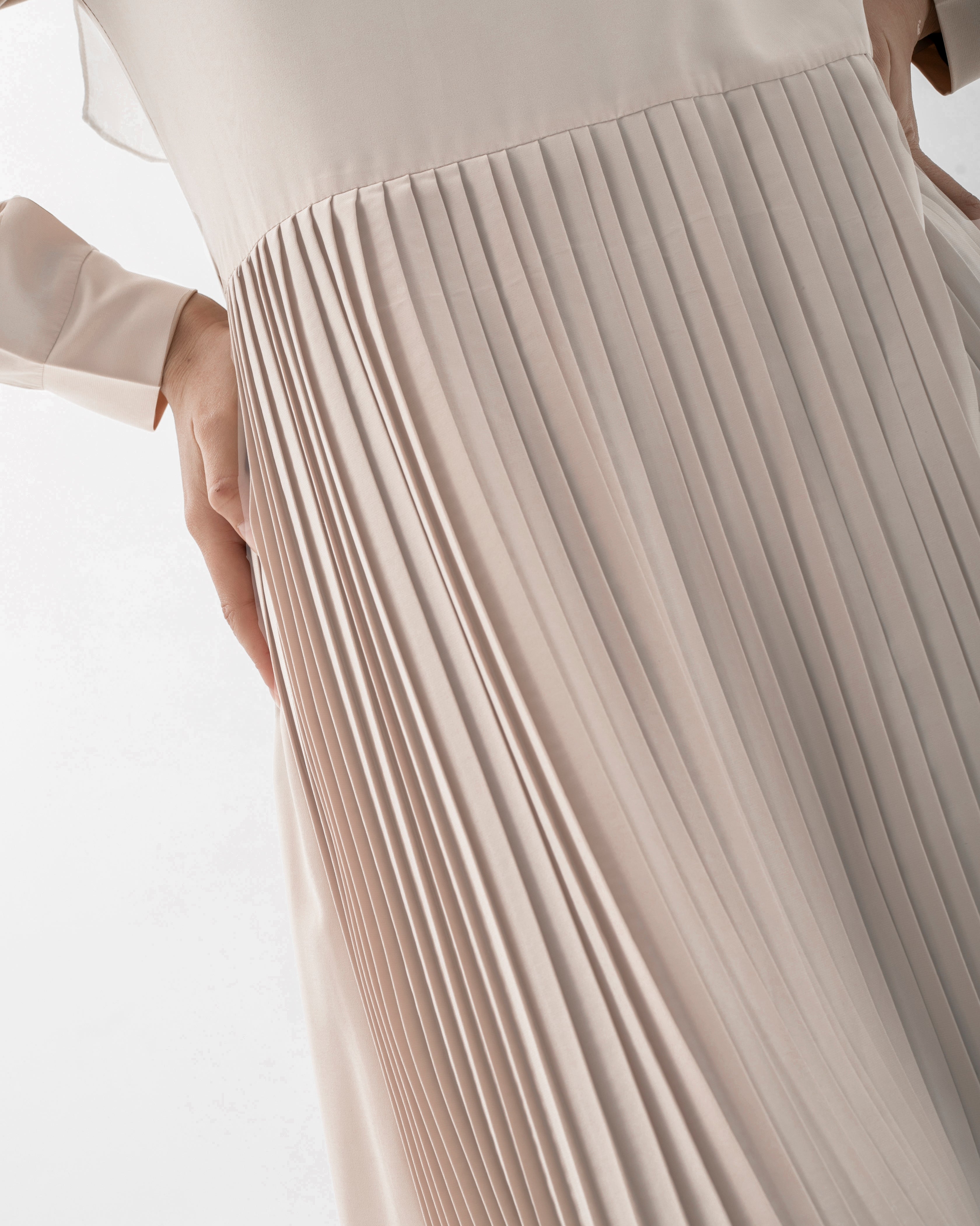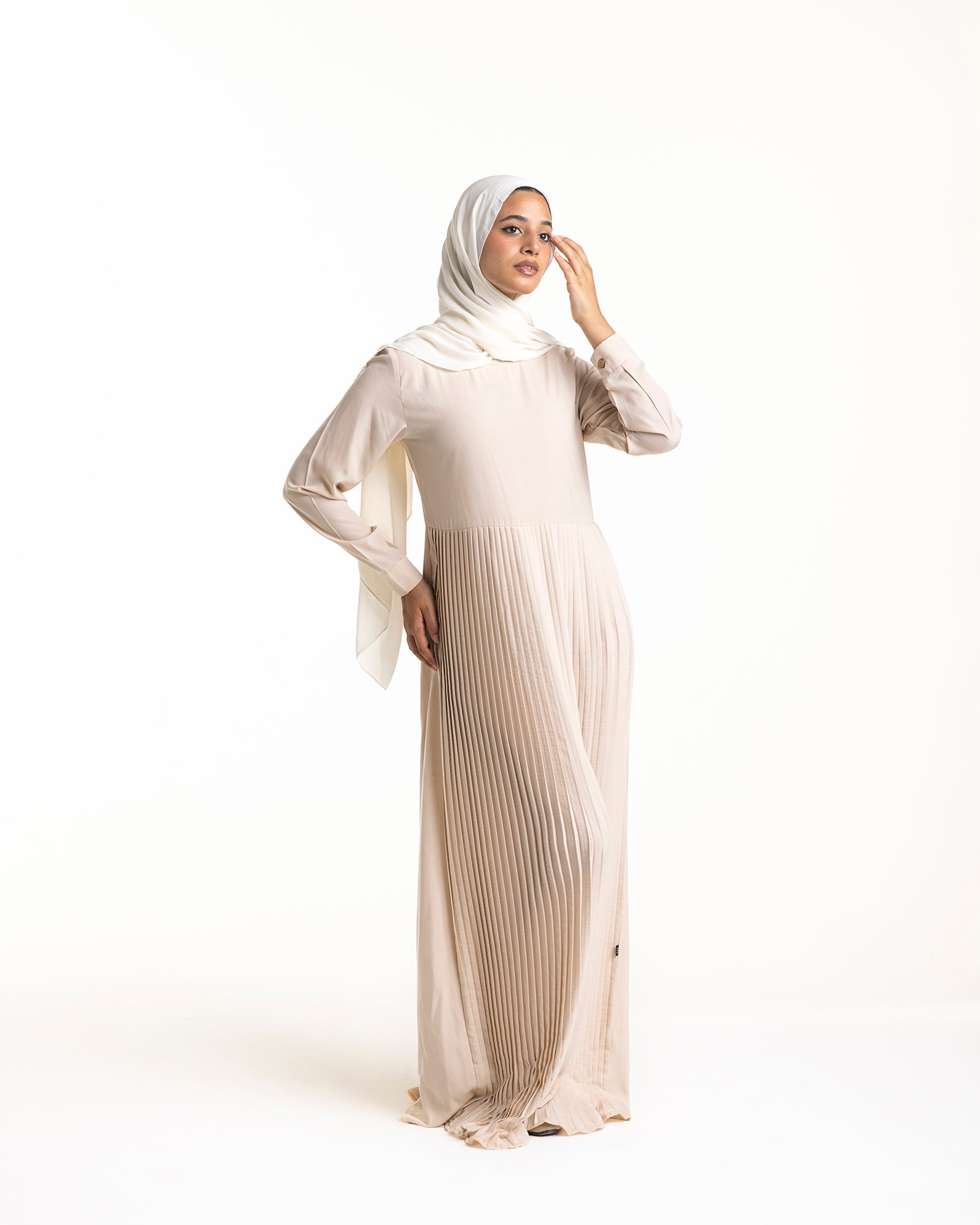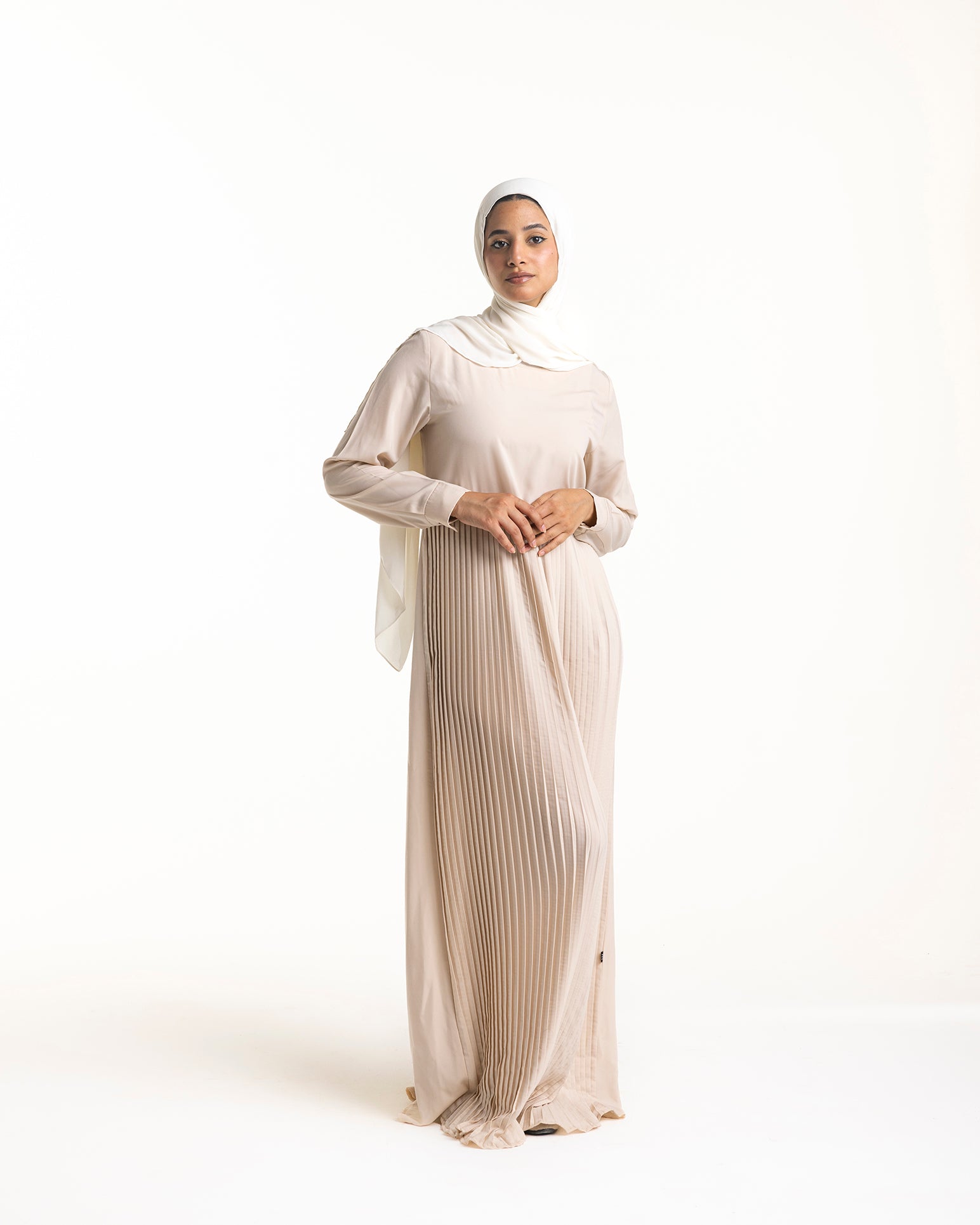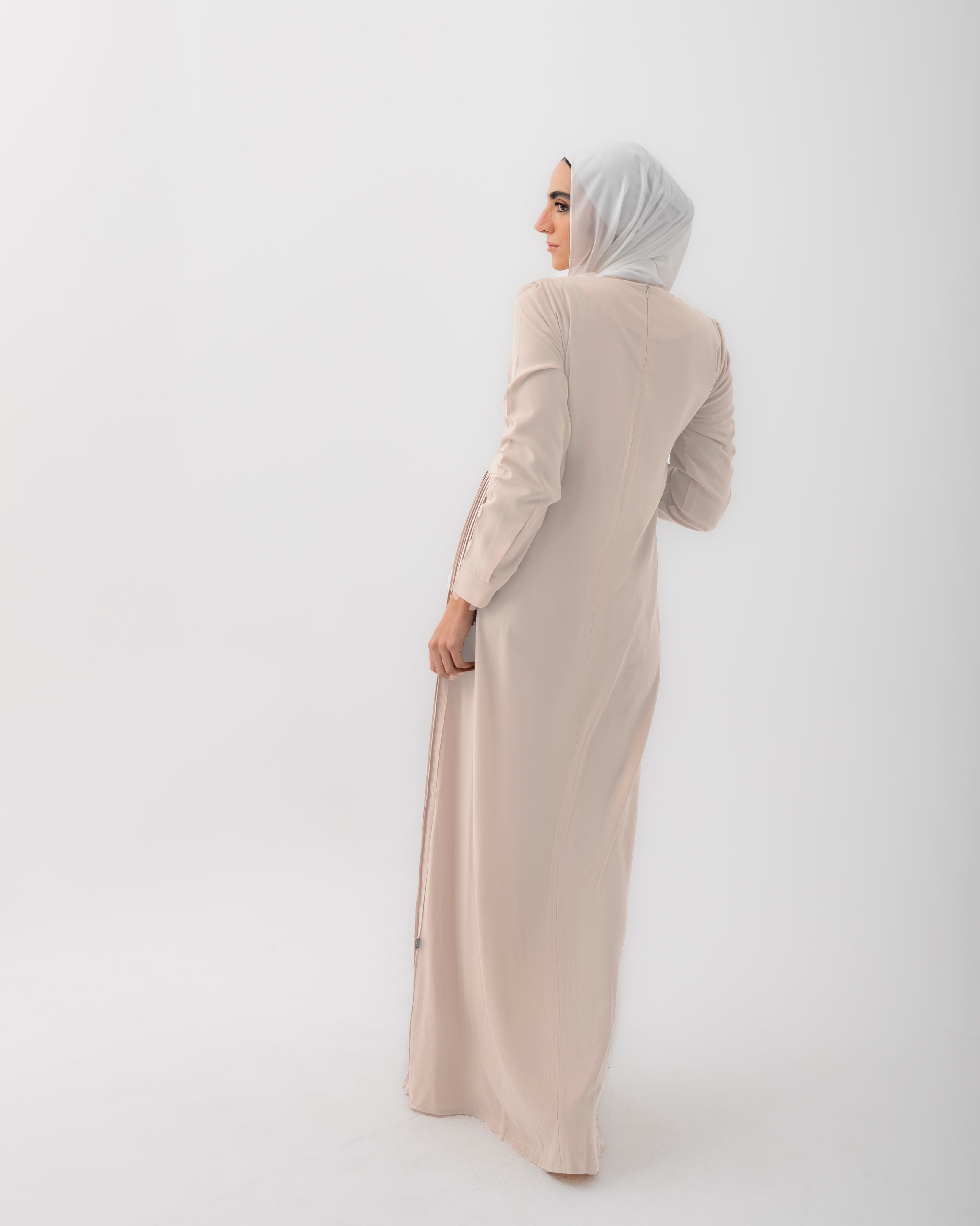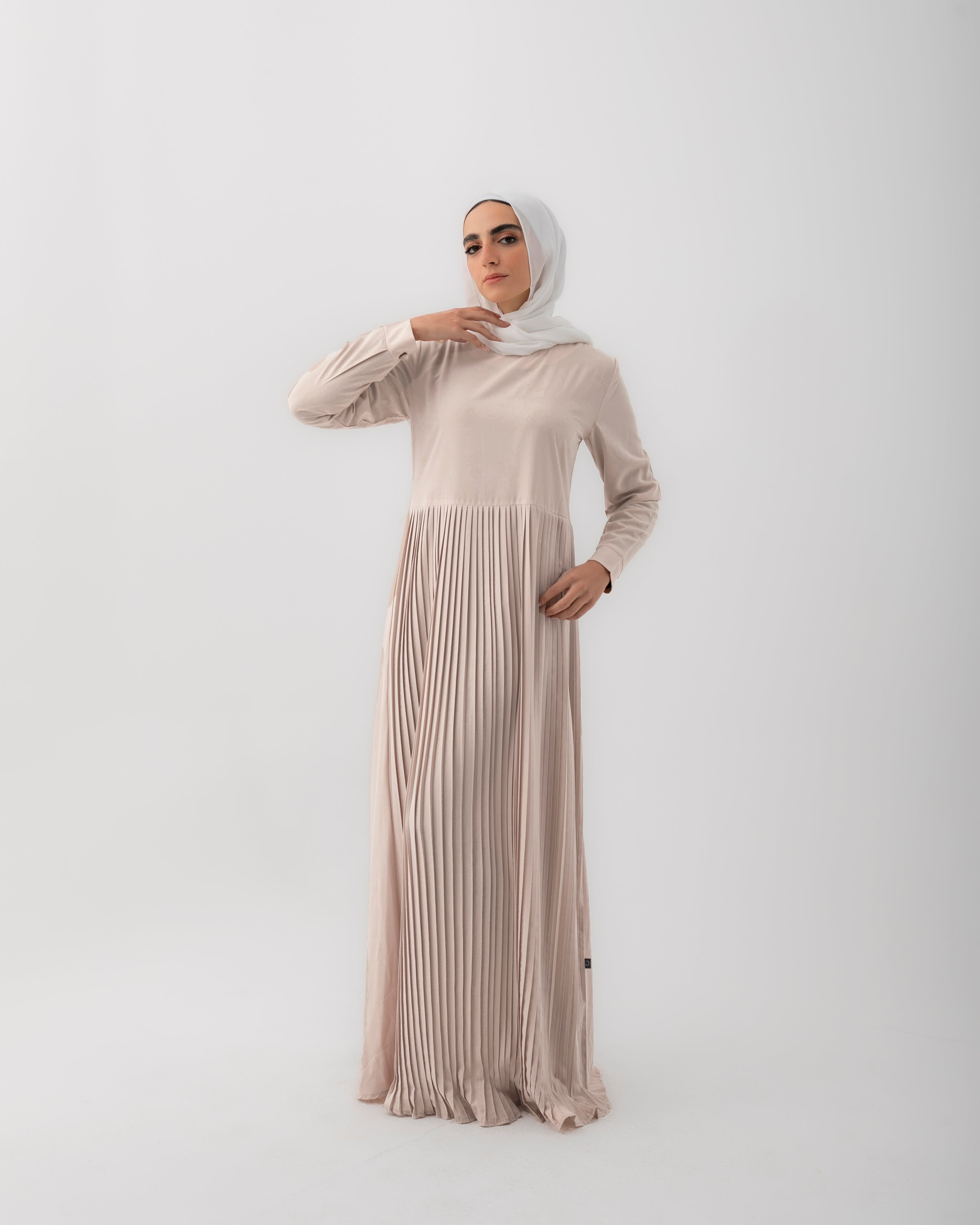 This dress is a testament to the beauty of simplicity. Crafted from high-quality crepe fabric, it drapes beautifully and feels incredibly soft against the skin. The classic silhouette features sleeves that provide modest coverage while maintaining a feminine and sophisticated aesthetic.