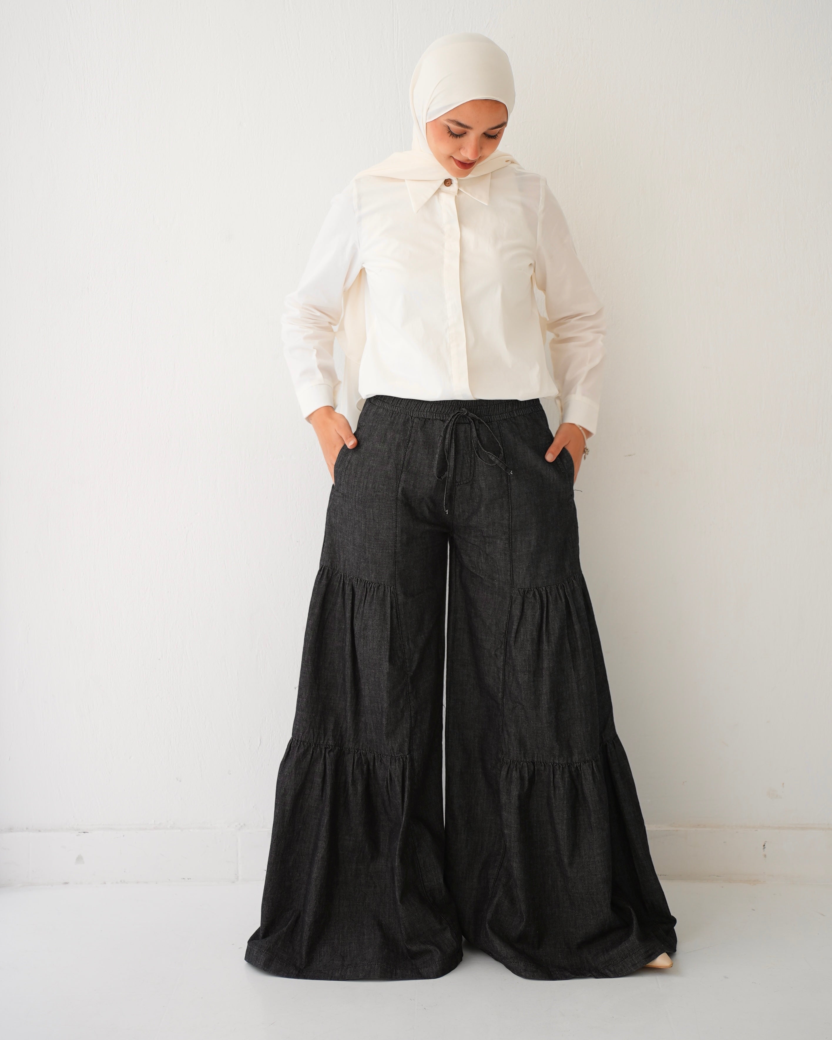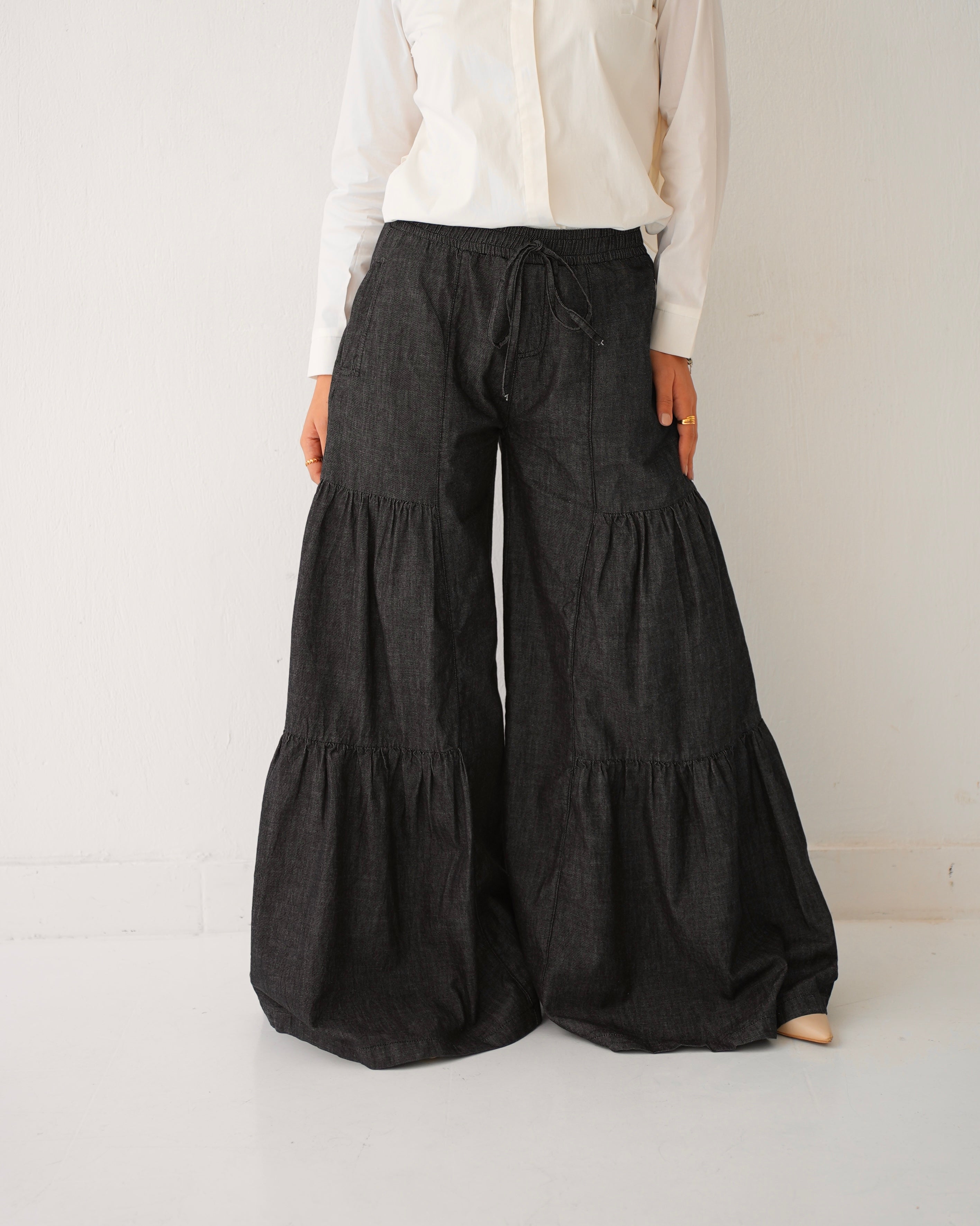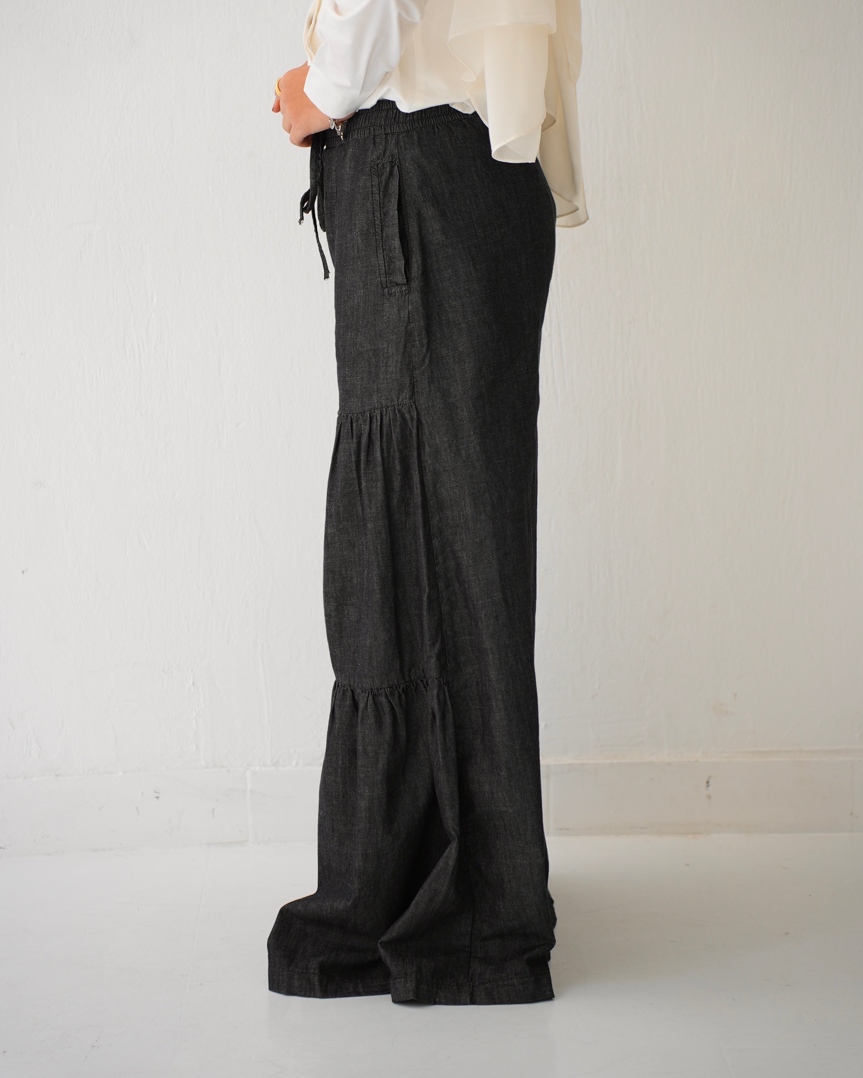 Tiered Wide Leg Denim Pants Black Grey C1902