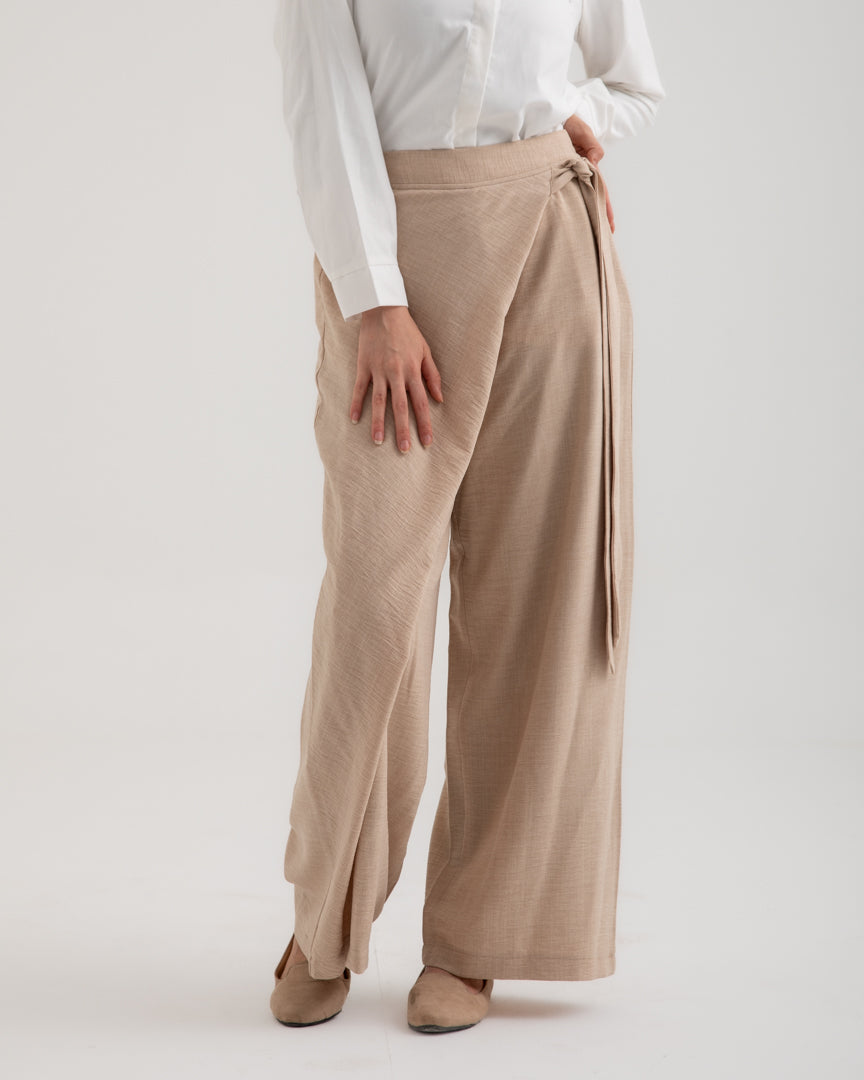 The side wrapped belt along with its soft french linen fabric and wide leg cut make for an utterly elegant, modest and comfortable pair of pants.